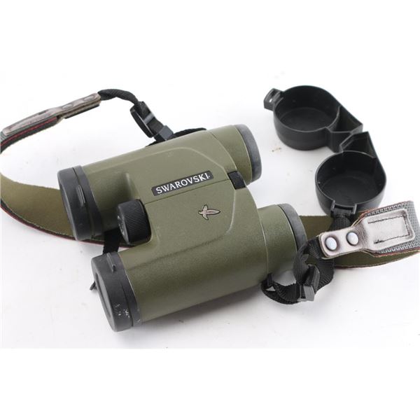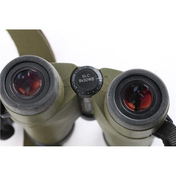 Swarovski Habicht SLC 8x30 WB, olive drab colored armored binocular with black lens covers and black nylon, green/black neoprene straps. S/N: D642542801. Made in Austria. Clear lenses, bright, sharp, true color fidelity, edge clarity, and wide field of view. Body is in very good condition with little to no wear on rubber body armor and paint wear on Swarovski label. Smooth focus knob. Rotating rubber up/down eyecups. Very good to excellent condition.