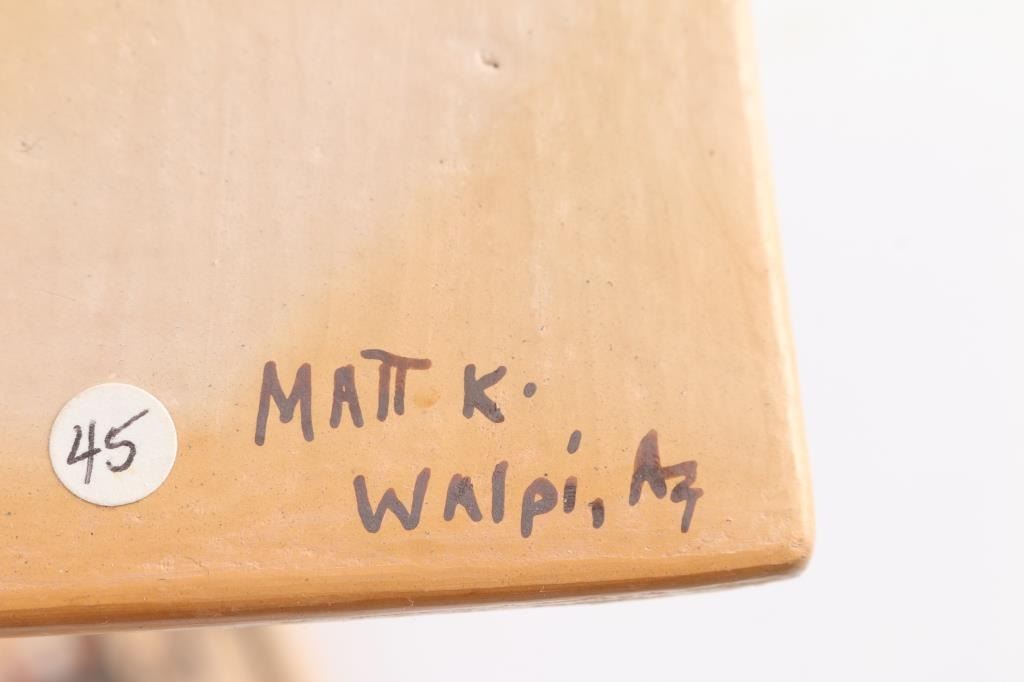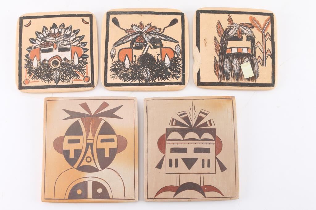 (2) Tiles with painted kachina heads by Matt K., Walpi, Az. Measuring 4 1/2" by 5" each. (3) Tiles with painted kachina heads, Hopi, measuring 4 1/4" by 4 1/4". One has a 1 1/4" chip on the side and one is cracked in back and repaired. (2) Mudhead rattles in good condition, measuring 8" in length and 11" around at widest point.
