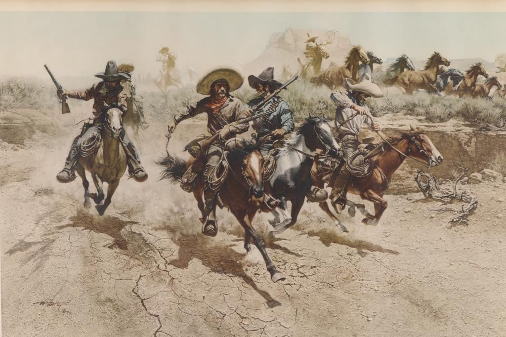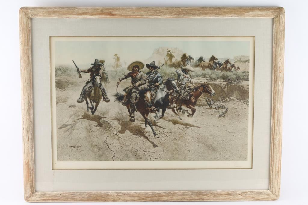 Scene of Vaqueros on horseback with a herd of horses. Signed in pencil. Measures 24"H x 32"W.