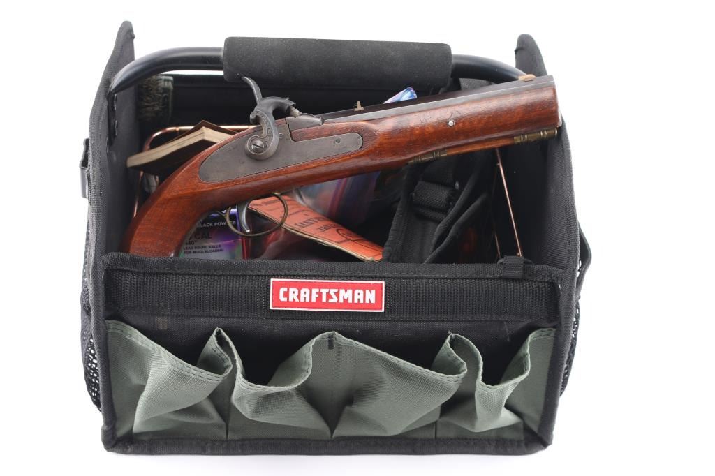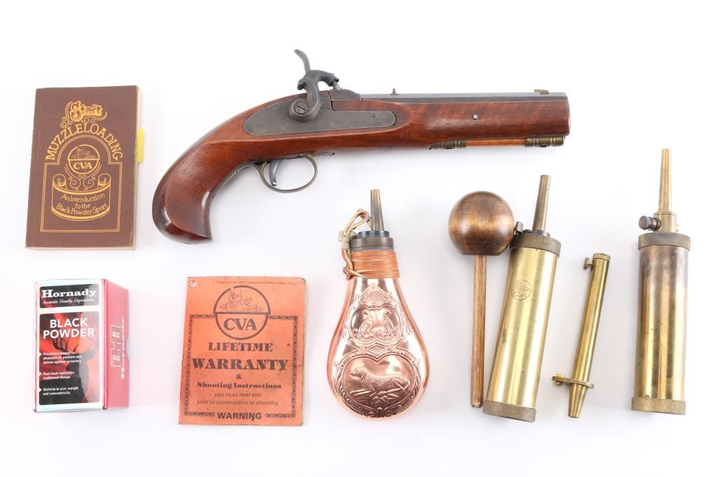Sn: 61322. Single shot black powder percussion pistol. Italian copy of the Kentucky pistol Imported by the Replica Arms co. El Paso TX. 6 3/4" octagonal barrel, fixed sights, wooden ramrod, brass ramrod thimbles, 1/8 twist. Two cock action is smooth, bore is very good, strong rifling, wood stock is very good/sound. Grayish metal finish. Comes with a heavy duty tool/range bag with 3 tins of No.11 caps, tools, extra nipples,box of 100 Hornady .440 lead balls, packet of lubed patches, 2 bullet seaters , tube of grease patch, powder measure, copper toned powder flask, two brass powder flasks with 30 grain spout, CVA and Traditions and a container of Hodgdon Pyrodex. Everything you need.NRA Condition-Very Good+. Antique Firearm.