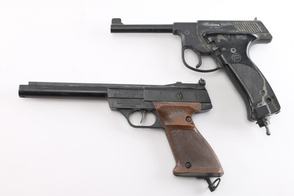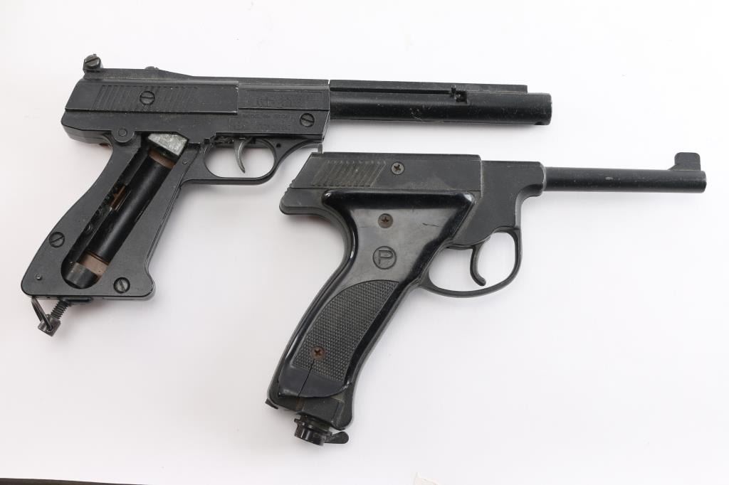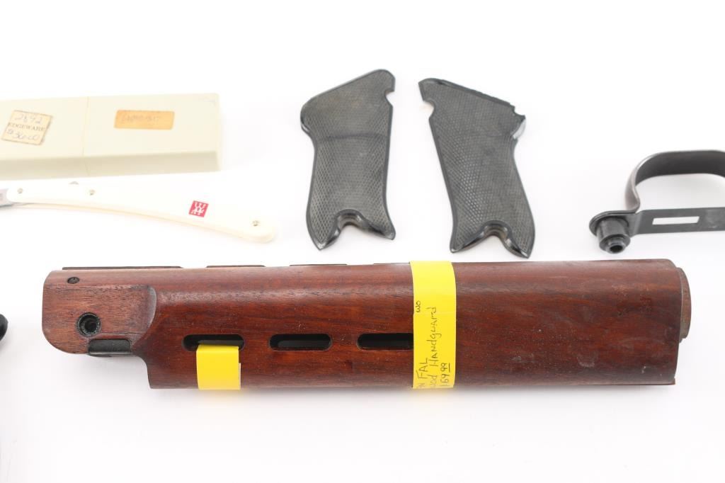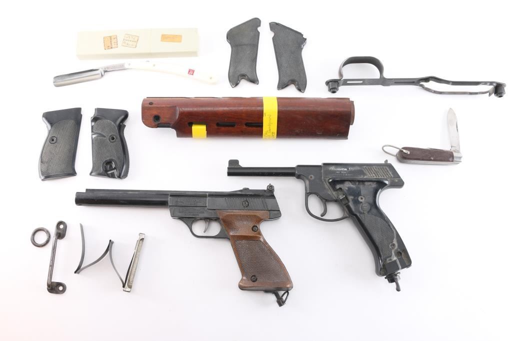 Crosman Airgun Model 454. Plainsman .175, G43/K43 trigger guard. Spring and follower. 1873 Trapdoor Saddle bar and ring. Luger P08 pistol grips. Walther P1/P38 grips. FN FAL handguard. Klein Tools pocket watch. Straight razor.