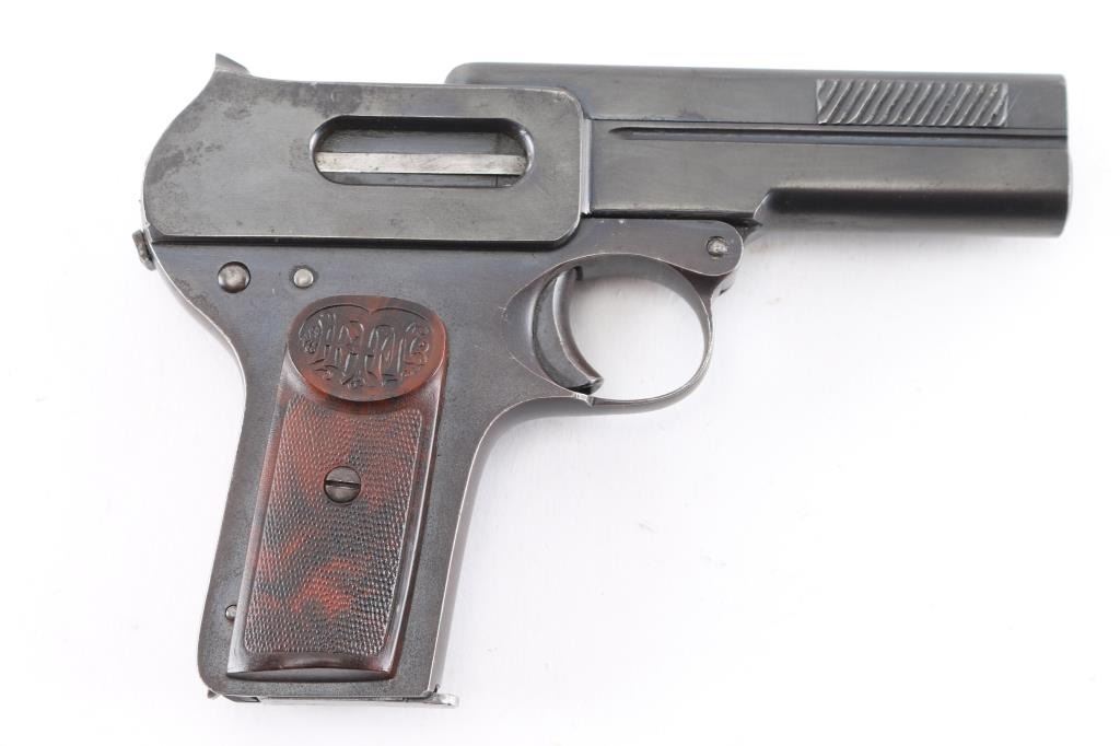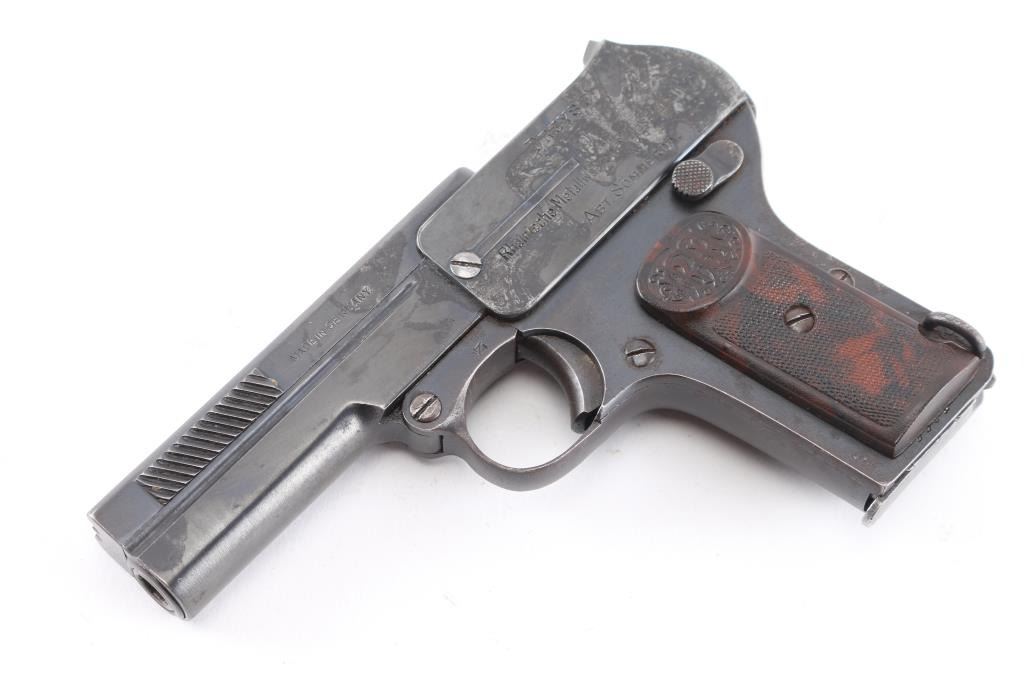 German striker fired semi-automatic pocket pistol chambered in 7.65mm Browning, manufactured circa 1907-1915. Features a blued finish, 3.7” barrel, fixed sights with ‘v’ front & ‘v’ notch rear in sighting groove, smooth trigger, manual safety on the left side of the frame, cocked indicator, heel magazine release, 7 round magazine, steel frame with lanyard loop on the left side and checkered two-piece red molted grips with “RMF” monograms. Bore is very good, bright, strong rifling. Retains about 75% finish, thinning and fading, the left bolt cover a patch of molted finish loss appearing if some kind of liquid spilled on it at some point. Reddish brown grips are very good.
