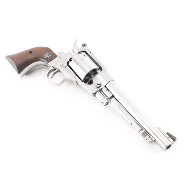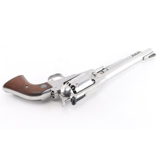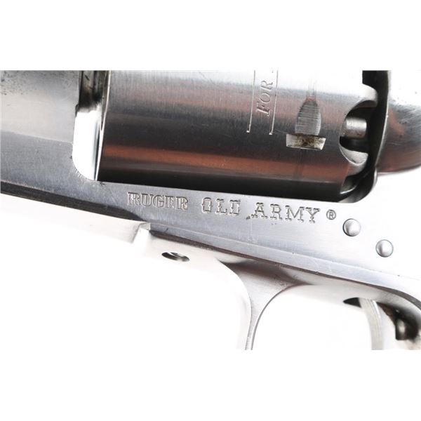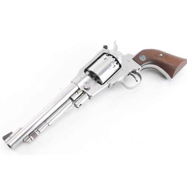 Single action black powder percussion revolver. Manufactured 1981. Features stainless steel construction, 7.5" barrel, loading lever, raised serrated ramp front sight, factory adjustable rear sight, serrated trigger, serrated hammer spur, non-fluted cylinder with safety stops, three-screw steel frame, two-piece smooth walnut grips with Ruger medallions. Bore is overall excellent/bright with a minor patch of pitting about midway, action is crisp with tight lock-up. grips are very good, SS finish has minor scratches/rubs, feint tracking on the cylinder. and minor patches of pin-prick pitting on the frame forward of the cylinder. Comes with a Civil War style black leather flap holster with "CS" embossed on the flap.NRA Condition-Good. Antique Firearm.