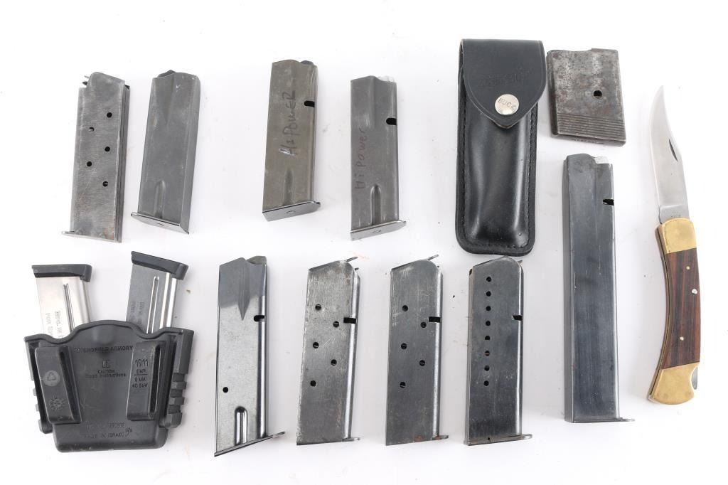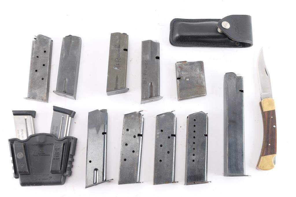 Includes (3) 1911 .45ACP magazines, (2) Springfield EMP .40cal magazines w/ double mag pouch, (5) Browning Hi-Power magazines, (1) Llama .45ACP magazine, (1) Winchester 1907 .351 magazine