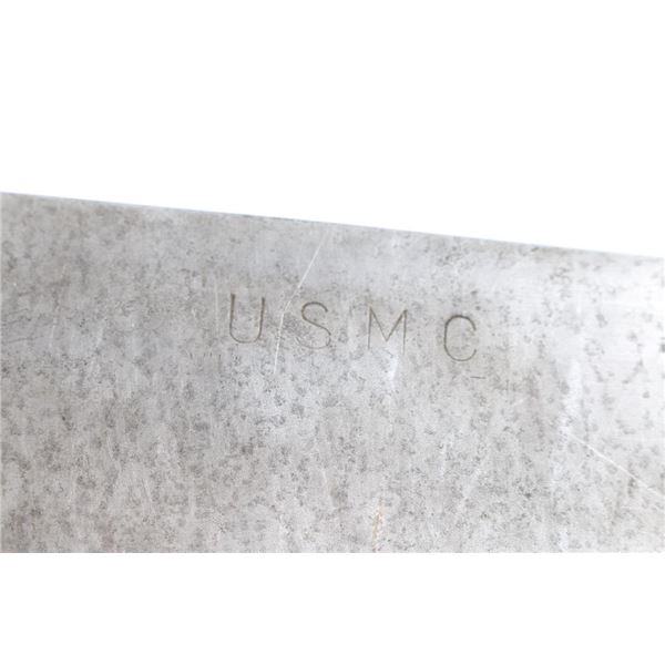 Large bolo Fighting knife/machete, 16 5/8" overall, with 11 1/4" blade, blade is 1/4" thick, marked "USMC" on left side of blade, wood grips w/brass rivets, no scabbard. Blade has pin prick pitting throughout, wood grip panels slightly worn due to aging, with some small scrapes on bottom of wood. Overall good condition.