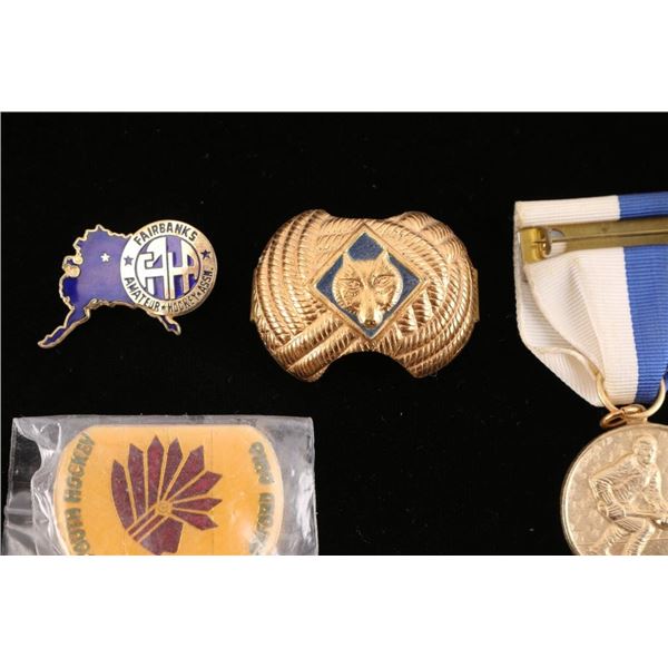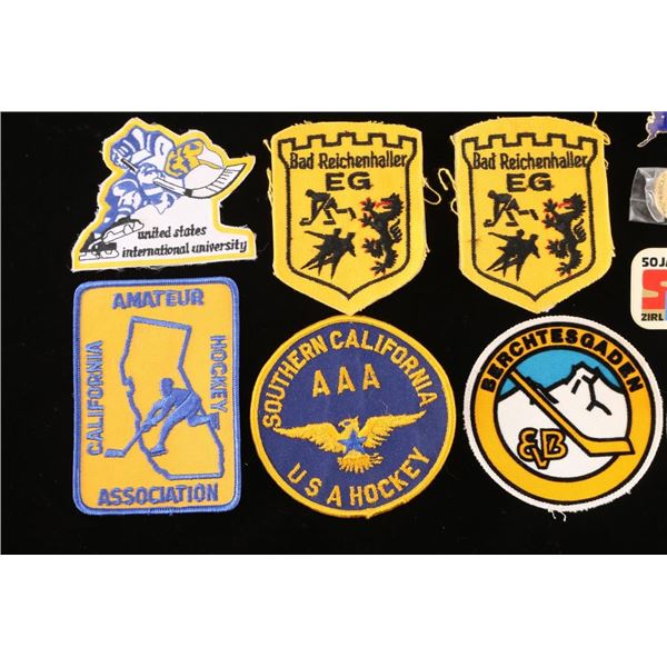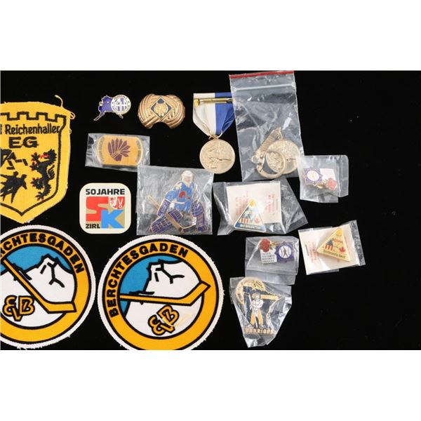 Includes amateur hockey memorabilia (9) pins, (7) patches, (1) medal, (1) keychain.