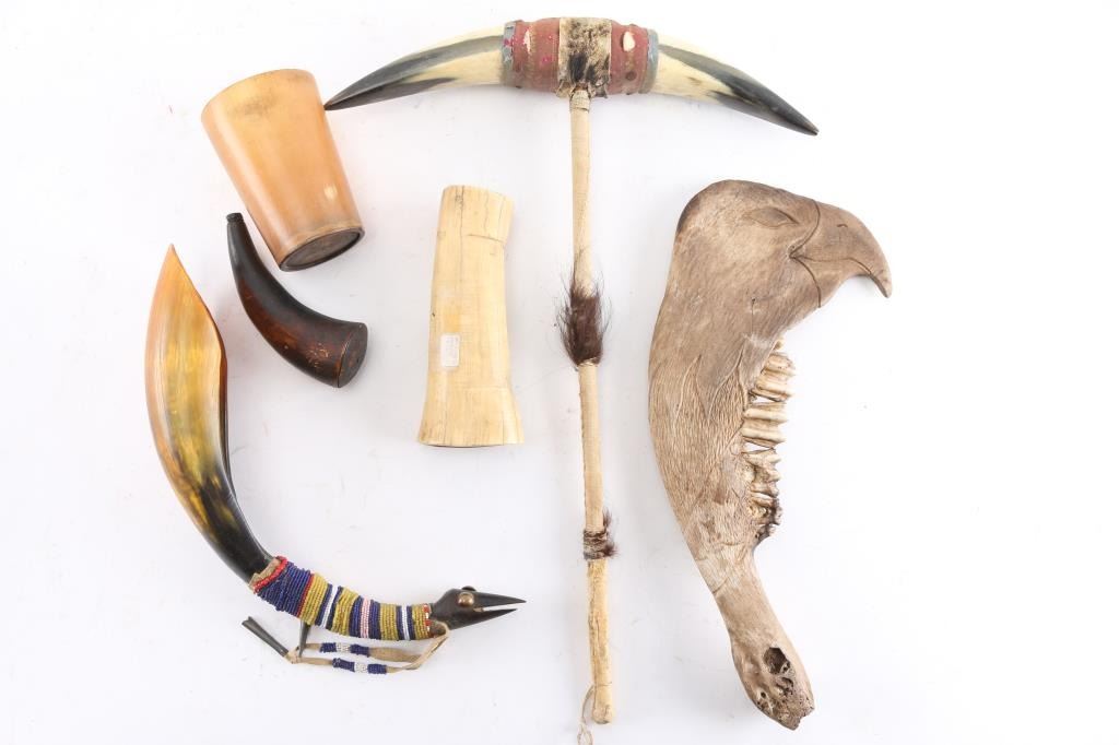 (1) Jawbone of large mammal, probably cow, with bird carving. (1) Horn carced into bird scoop with beaded collar and leather tie. (1) Carved slit in bone. (1) Bullhorn club. (1) Powder horn. (1) Corn drinking cup.