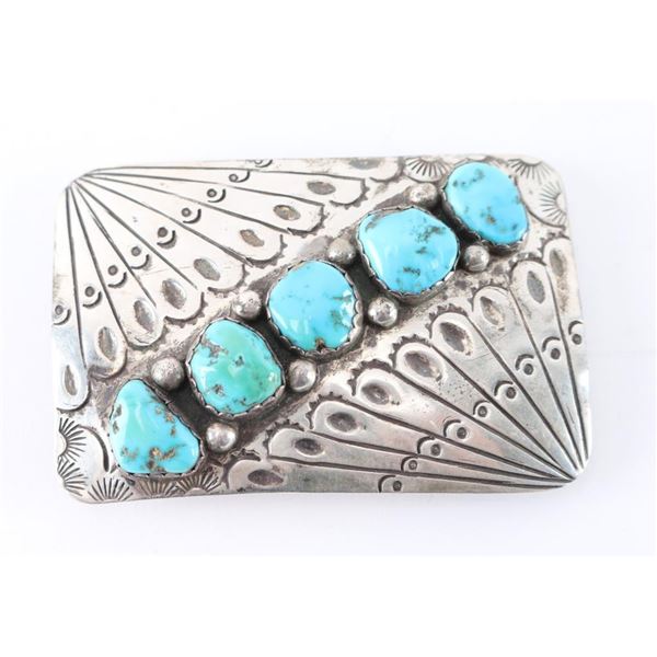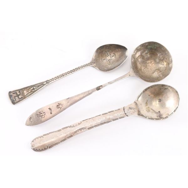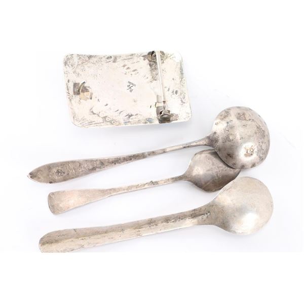 (1) Sterling silver belt buckle with 5 turquoise stones, maker marked RP with a lightening bolt, size 3 1/4" x 2". (3) Sterling silver spoons with native American designs.