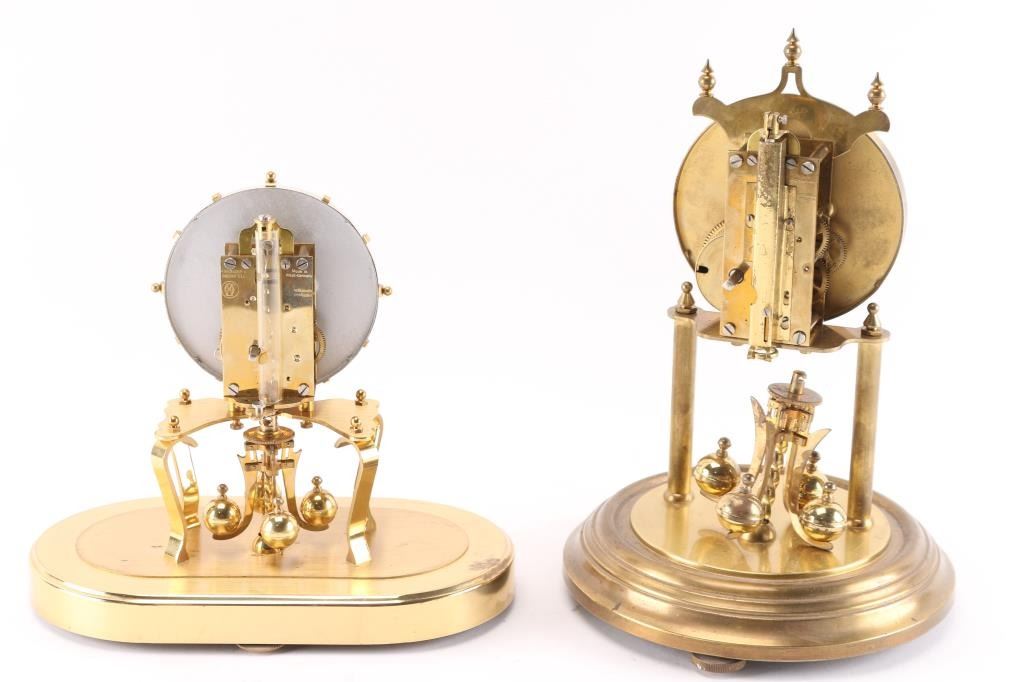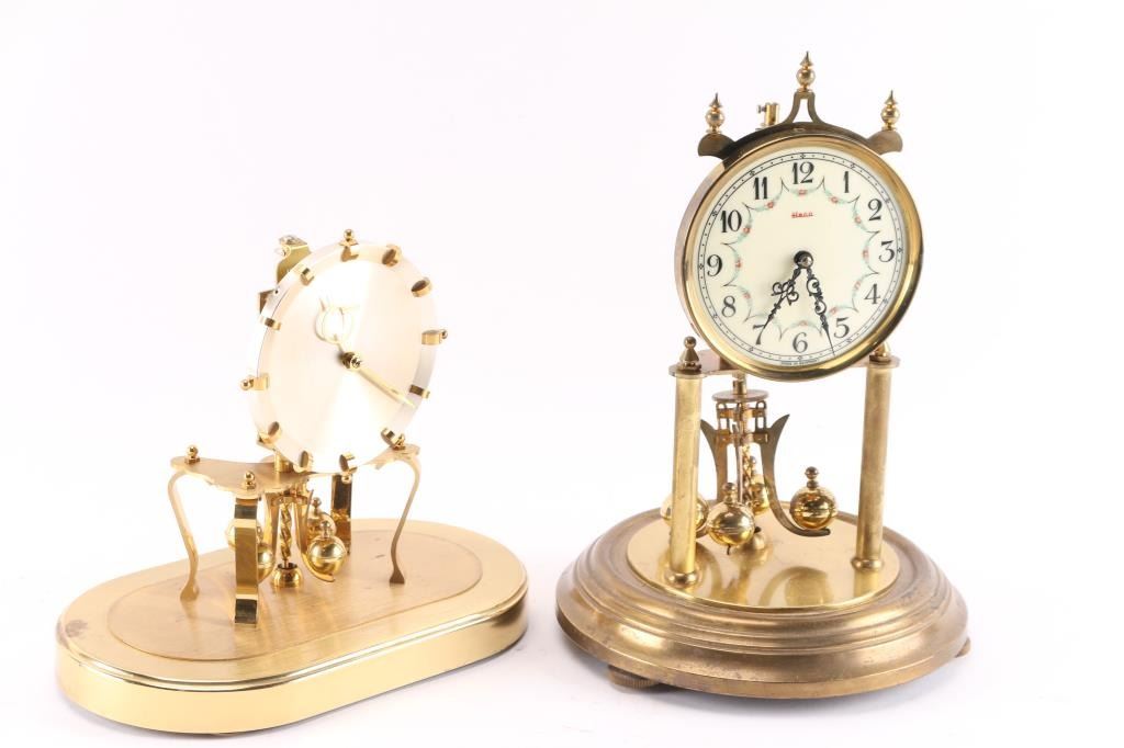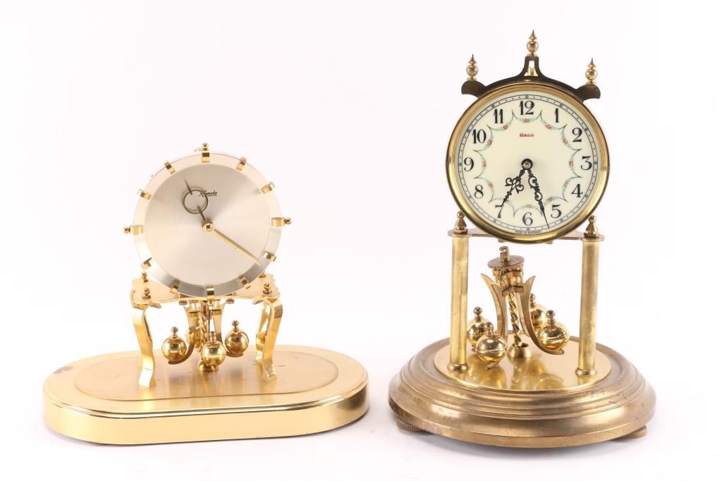 (1) Kundo Kieninger & Obergfell Anniversary clock w/ oval glass. 4" dial. 9-1/2"H x 9-1/2"W. (1) Heco West German clock w/ dome glass. 4" dial. 12-1/2"H x 8"W.