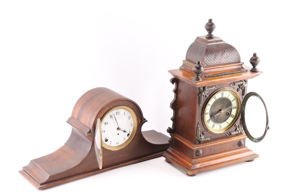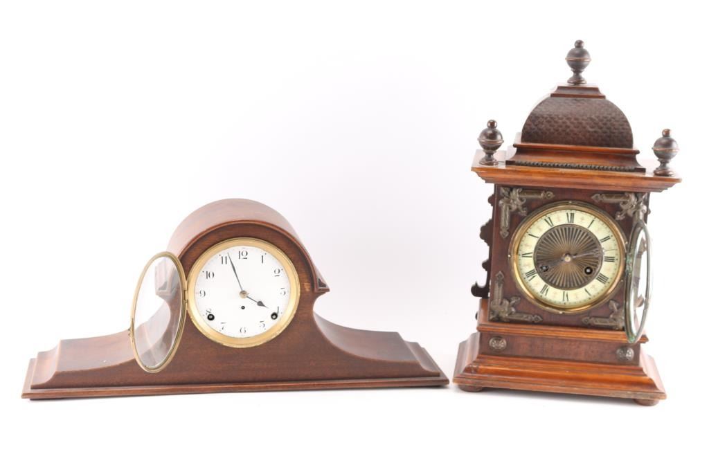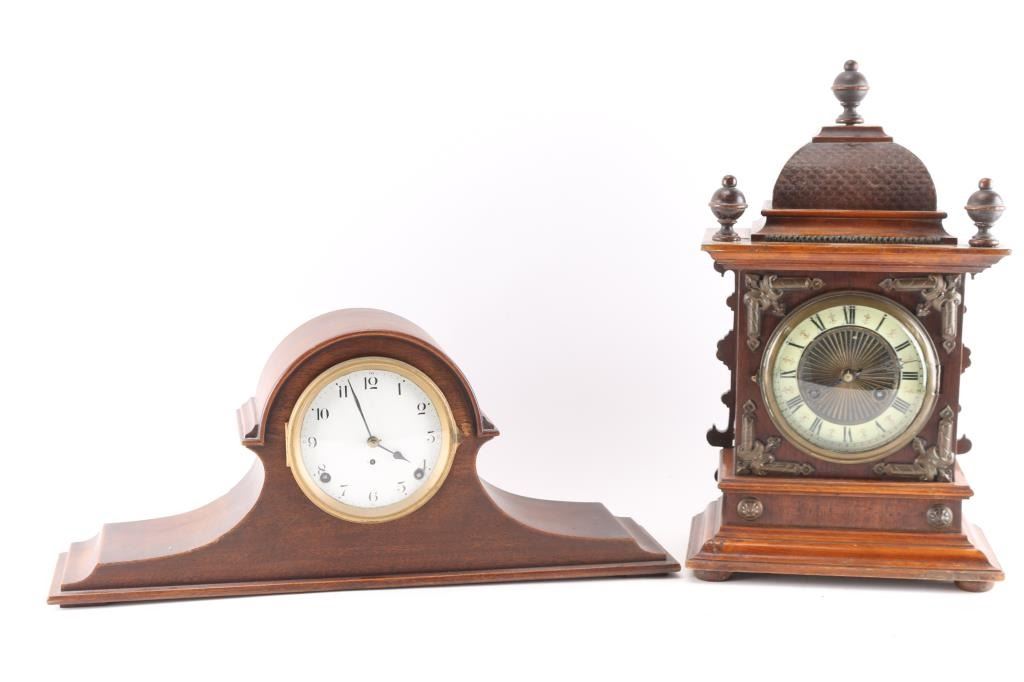 (1) Junghans mantel clock w/ pendulum and key. 5" dial. 18"H x 10"W. (1) Seth Thomas mantel clock w/ pendulum and key. 4-1/2" dial. 9"H x 21-1/2"W.
