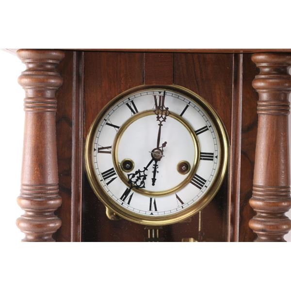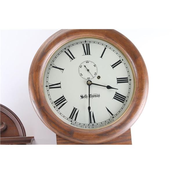 (1) German wall clock w/ pendulum and key. 5" dial. 26"H x 13"W. (2) Seth Thomas wall clock w/ pendulum, key and weight. 11" dial. 26"H x 16"W.