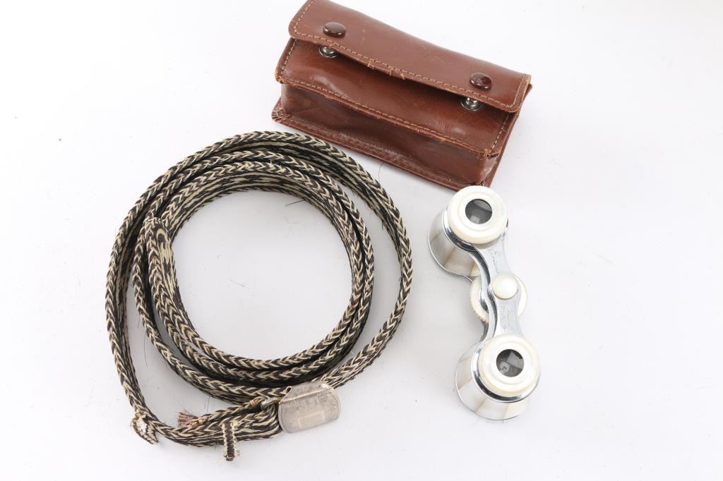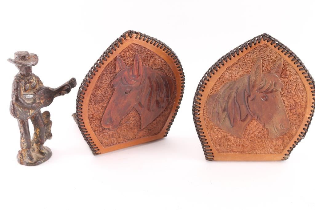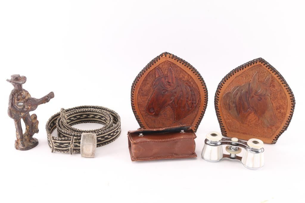 (1) Pair of tooled leather bookends, with horse head design, measure 6" tall and 5" wide.(1) Mother of pearl opera glasses in leather case, inscribed "Erisa", maker marked KKK.(1) Horsehair belt measuring 43" long and 1" wide.(1) Rusted iron cowboy next to cactus playing guitar.