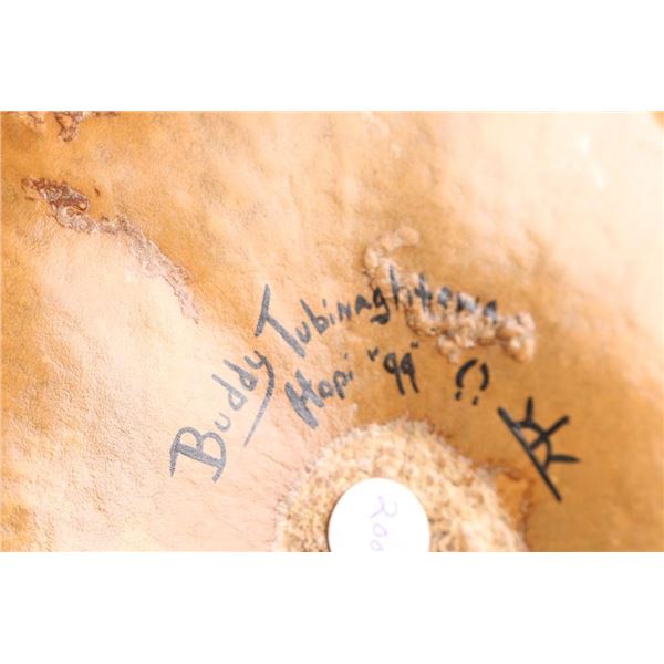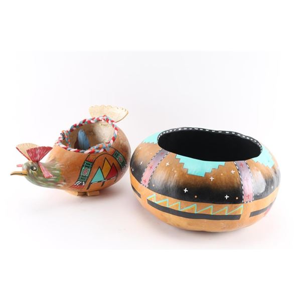 The largest is signed on bottom, Buddy Tubinaghtewa, Hopi, 99. Measures 7" tall by 12" around, approximately. Retails for $200. The other gourd is painted to be a chicken with carved wood attributes. Measures 7" tall by 13" length.