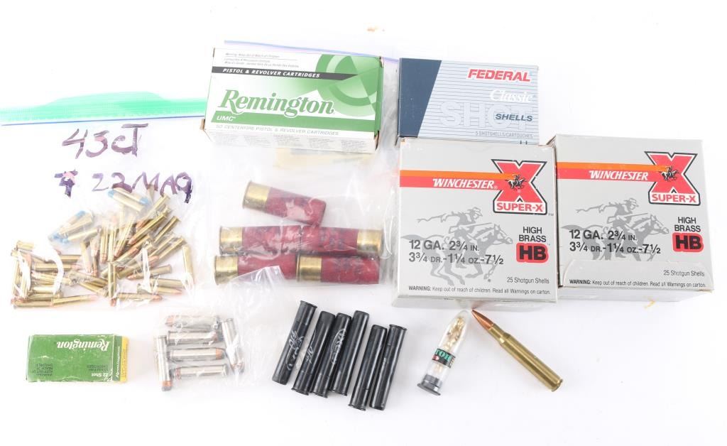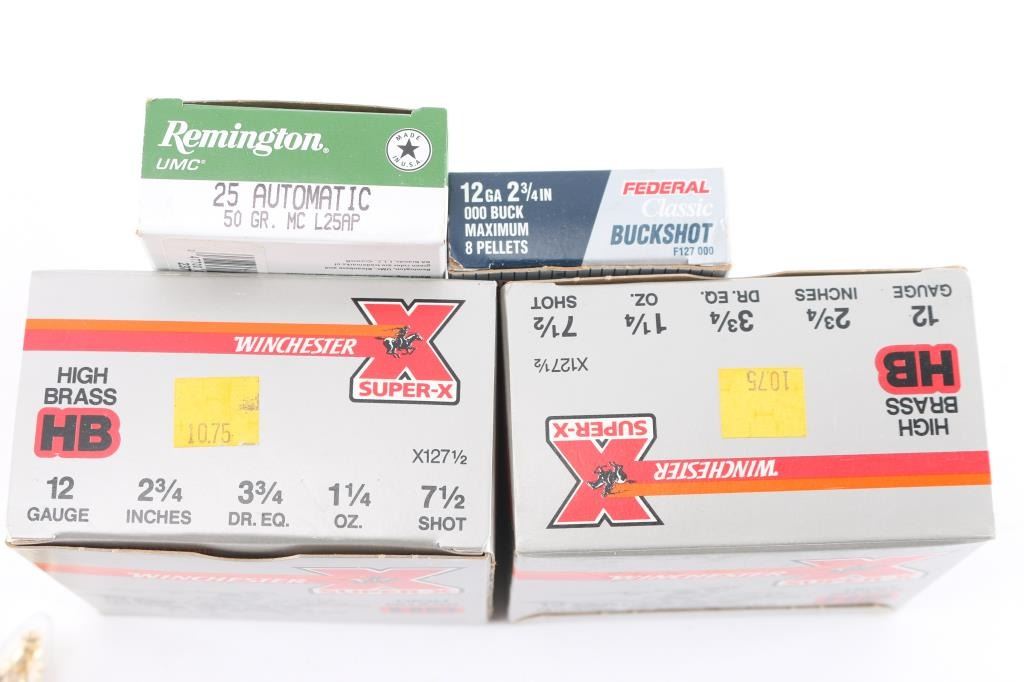 Inldues: approx. 60 rds of 12 gauge shotshell, Winchester 7 1/2 shot, 2 3/4" & Federal 000Buck, 2 3/4"; approx. 50 rds of 25 ACP, Remington 50 Gr. FMJ; approx. 40 rds of 22 Mag, CCI & approx. 50 rds of 22 LR blanks, Remington. All factory new ammunition, most in factory boxes.