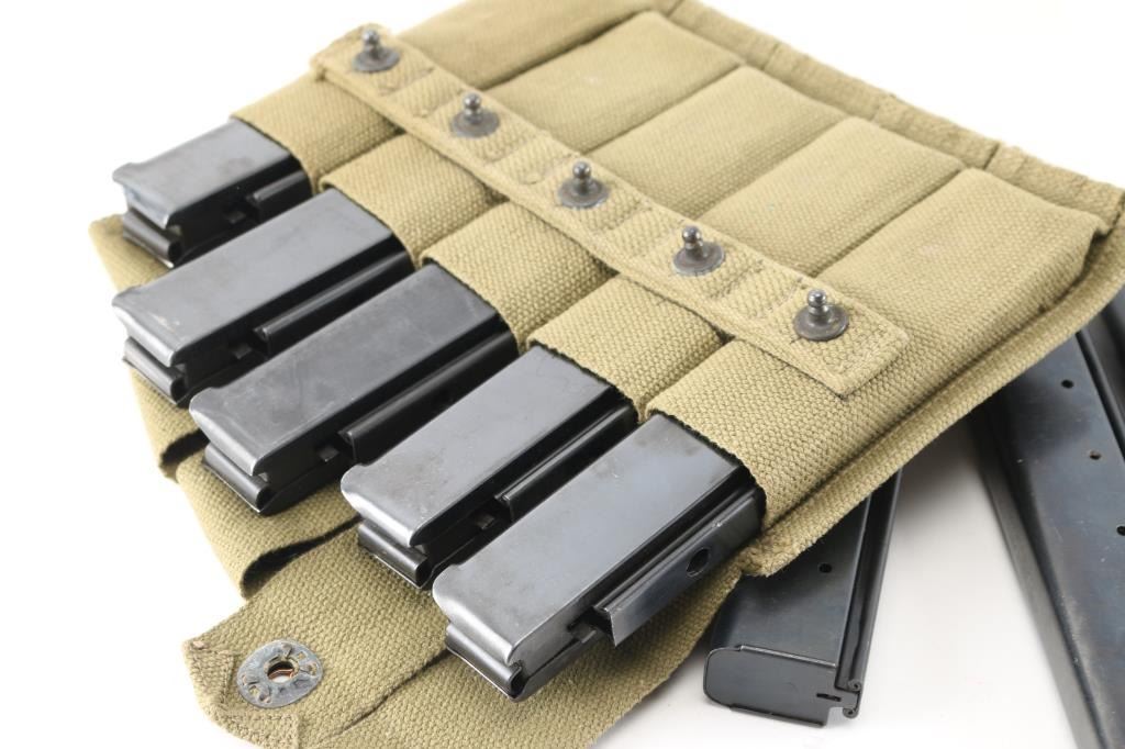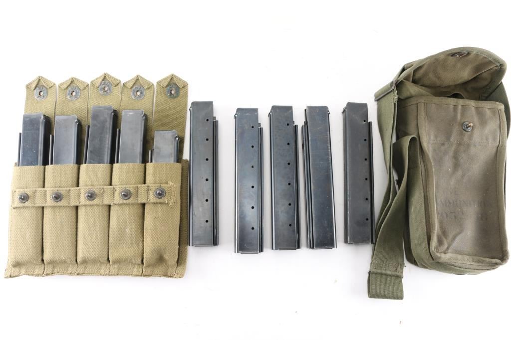 Five - 30 rd mags, four marked "Seymour" (very good condition) and one Crosby (good condition), in a green cotton web pouch with belt loop and shoulder strap. Plus five - 20 rd mags, three marked "Auto Ordnance" and two marked "Seymour", in olive drab cotton web pouches, all in very good condition.