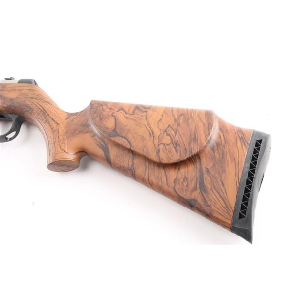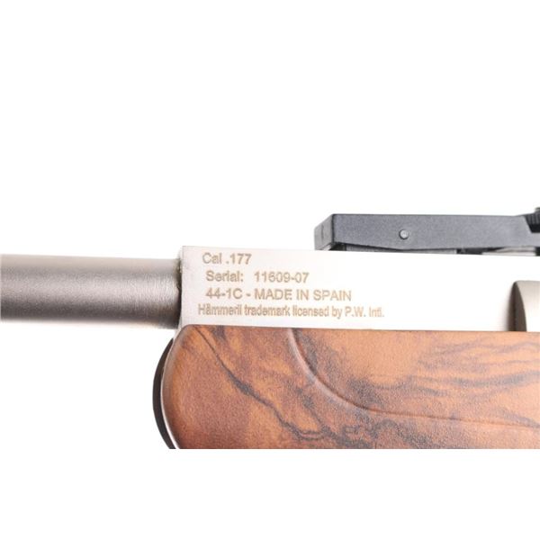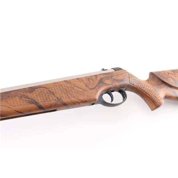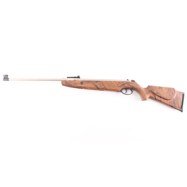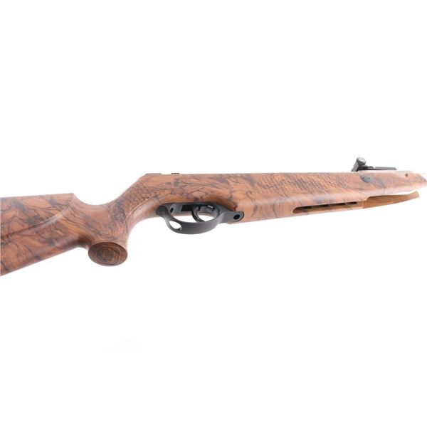 Swiss made spring loaded air rifle, 19 1/2" barrel with ported, hooded red fiber optic front and adjustable green fiber optic rear sight, satin grey finish, polymer wood grain stock with ambidextrous cheek rest, vented rubber recoil pad. Like new condition. Comes in factory box with manual.