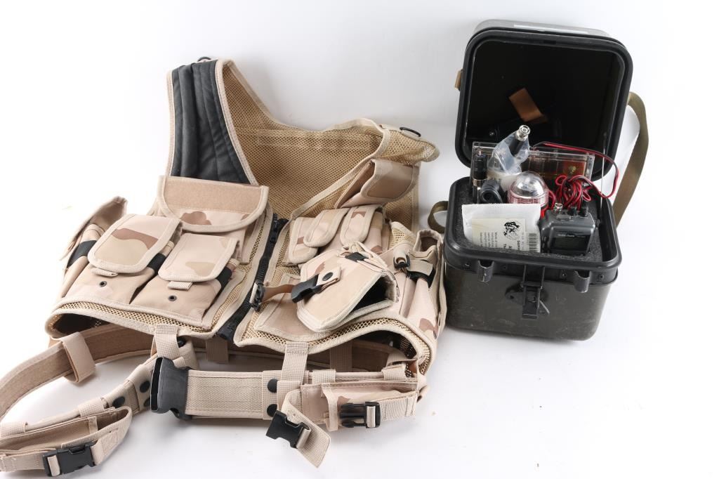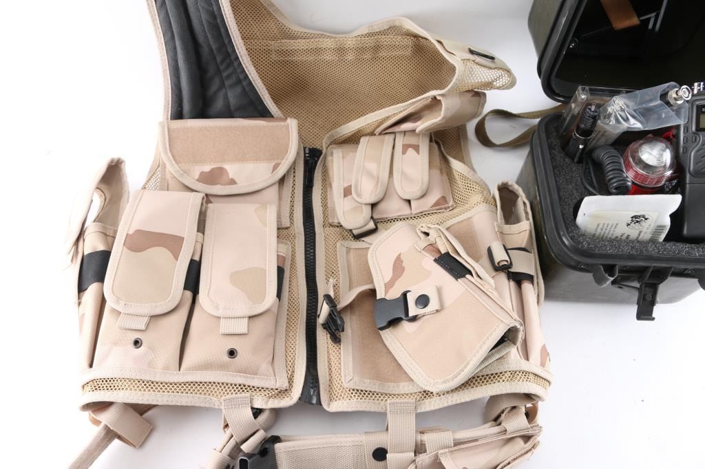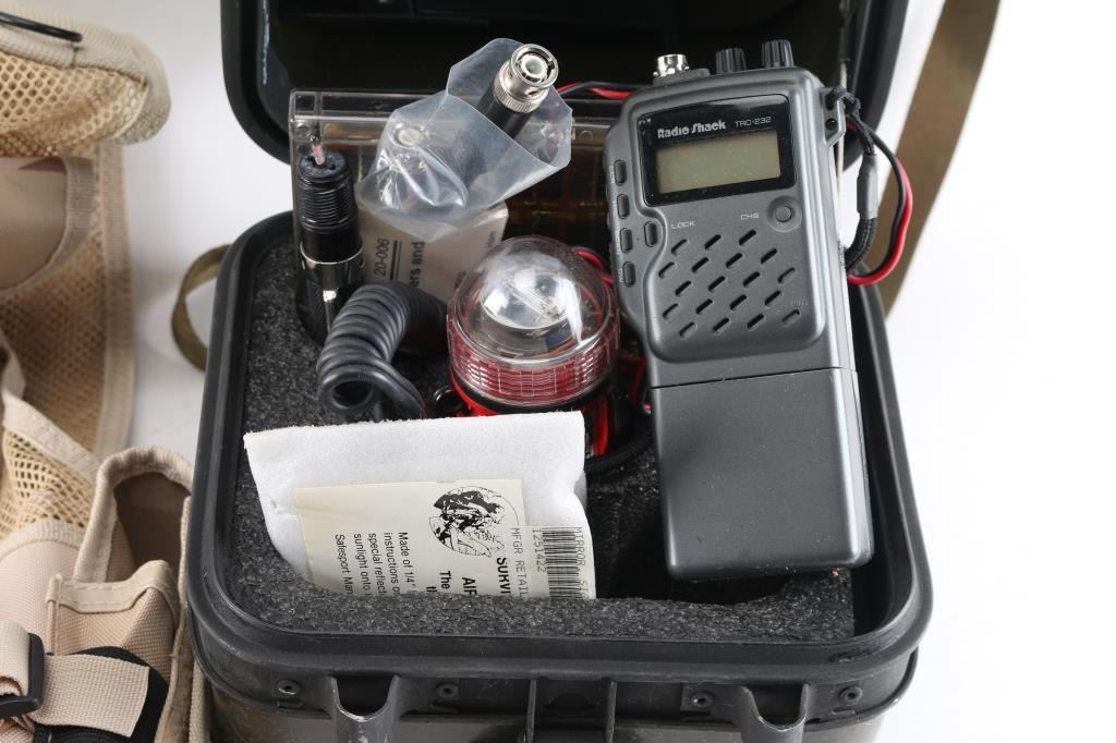 Includes a UTG desert camo Blackhawk style tactical vest (size XL, barely used), Radio Shack TRC-232 FRS hand radio w/antennas & car charger, signaling mirror, USCG Fulton battery operated beacon & digital light panel, in military water proof case w/ green nylon carrying strap.