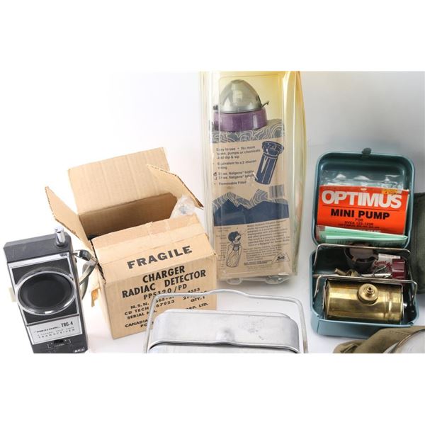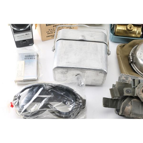 Includes: 1 - Realistic TRC-4, 2 channel solid state transceiver; 2 - military canteens (U.S. cold weather & NVA); 2 - WW2 mess kits (U.S. w/utensils & canvas cover other German); 1 - Optimus mini camp stove in tin container, made in Sweden w/ canvas pouch; 1 - military fishing kit in tin case; 1 - Outback filtration bottle; 1 - Big Beam light w/car lighter hookup (200,000 candlepower); 8 - Canadian Armed Forces Radiometers (Cold War Era, used); 1 - U.S. Army old UCP camo pattern M-9 pistol holster; 1 pr - U.S. goggles w/clear lens & 1 - U.S. military green canvas sleeping bag case. Most in serviceable condition.
