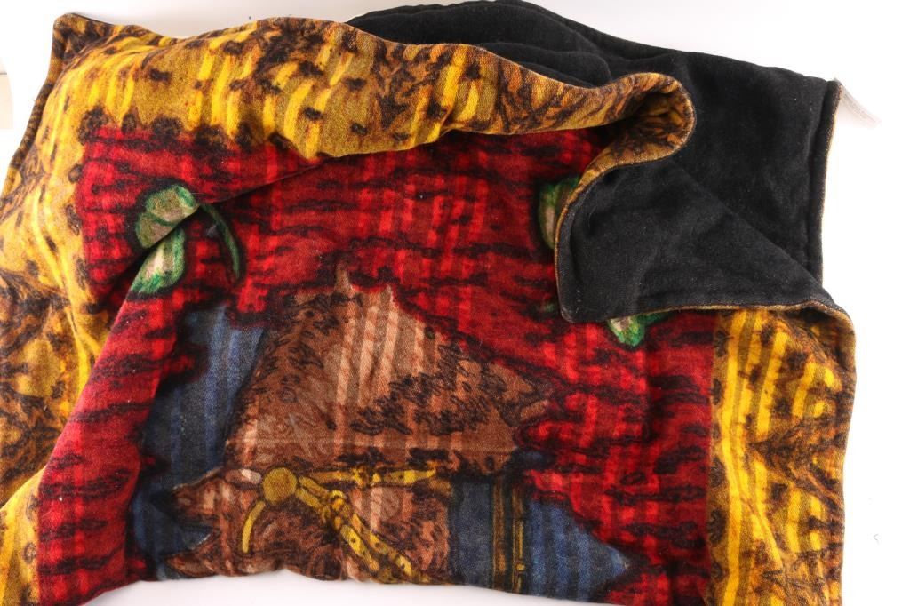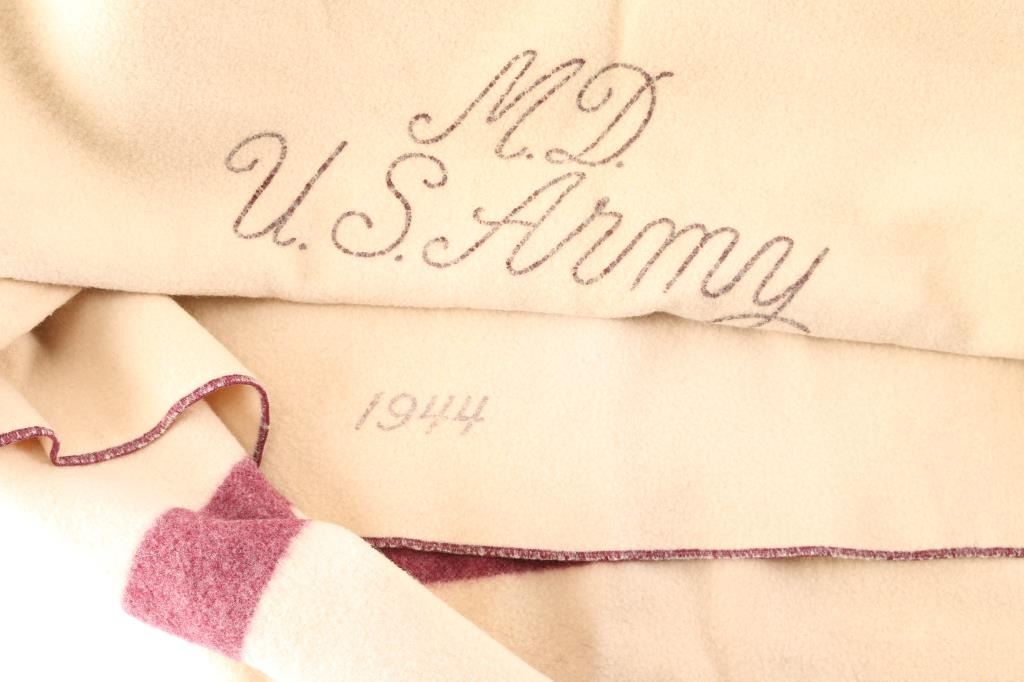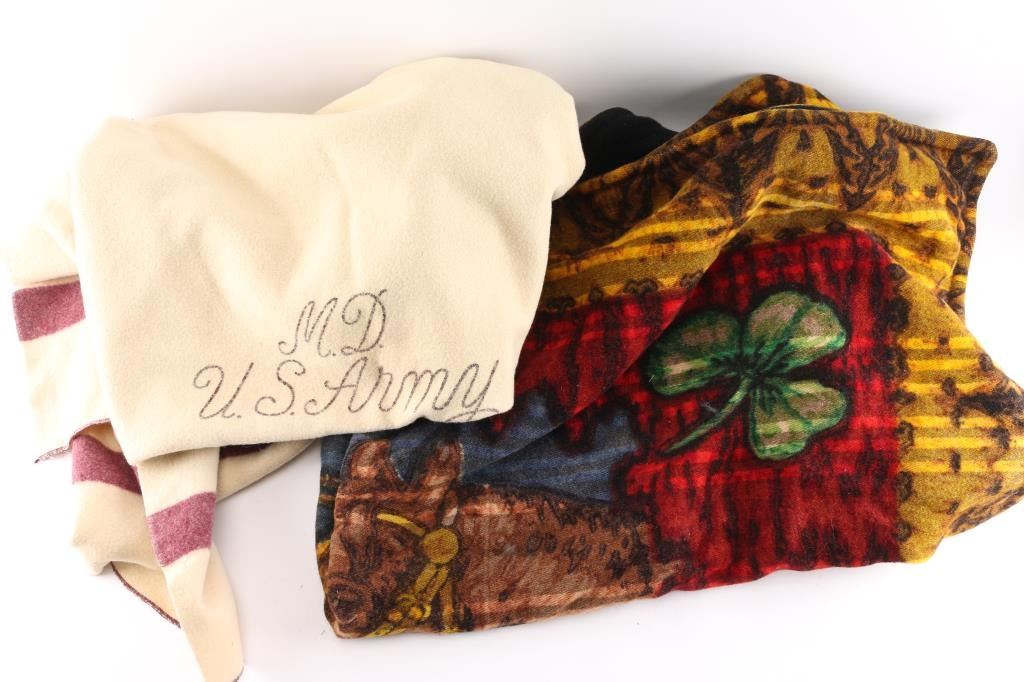 (1) Carriage blanket measuring 44" x 59" with a horse- head profile and 4 green shamrocks, in yellow, red and blue.(1) Army blanket measuring 51" x 73", with "M.D. U.S. Army" and "1944" in maroon on off white.