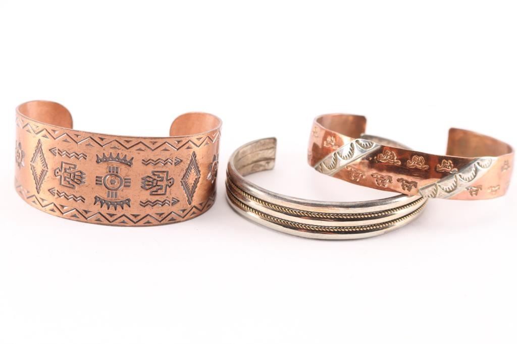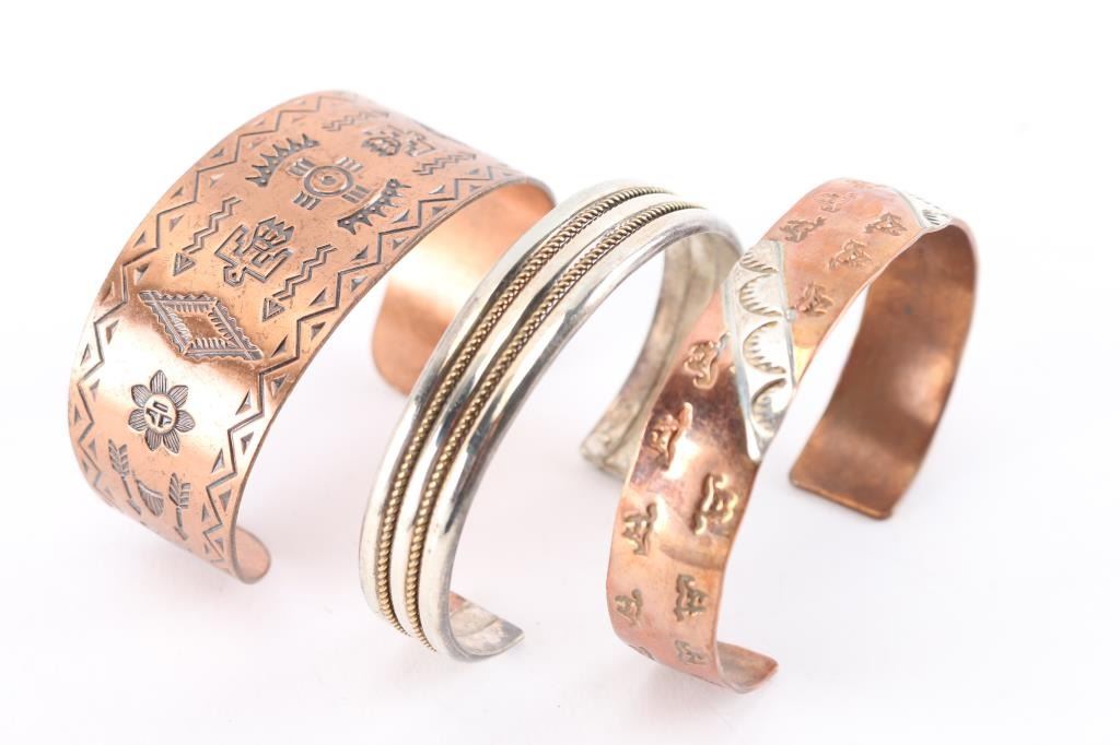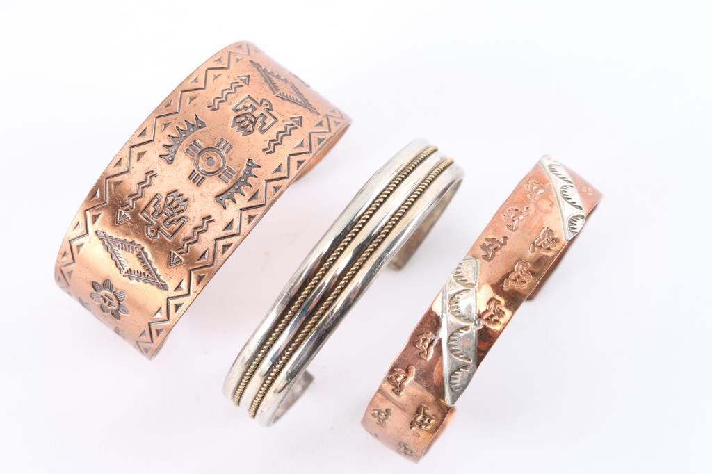 (2) With native design, one measures 1 1/4" wide, 7" with gap, and one measures 1/4" wide, 7 1/4" with gap, and has silver accents. (1) One is sterling silver with 2 copper braids and is 1/4" wide and 7" with gap.