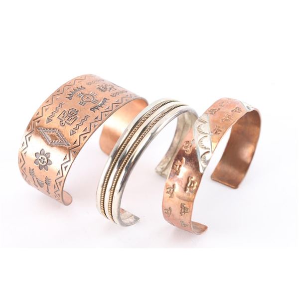(2) With native design, one measures 1 1/4" wide, 7" with gap, and one measures 1/4" wide, 7 1/4" with gap, and has silver accents. (1) One is sterling silver with 2 copper braids and is 1/4" wide and 7" with gap.