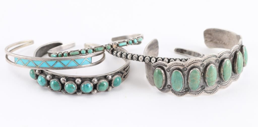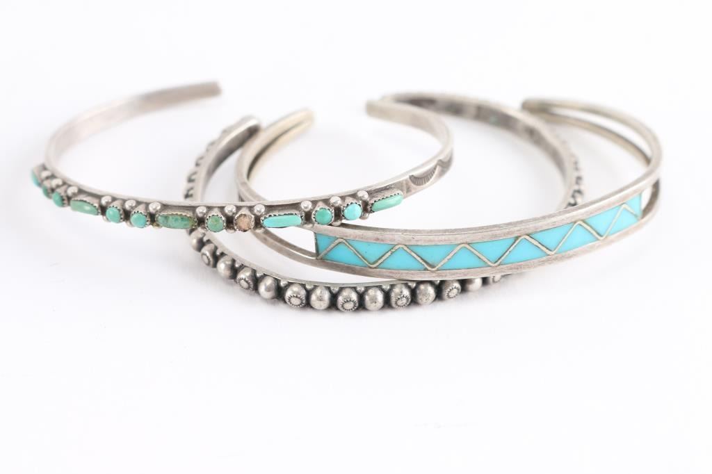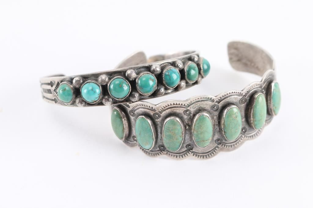 (1) Old pawn cuff with 7 oval pieces of light green turquoise, measures 7 1/2" including gap. (1) Old pawn cuff with 7 round pieces of blue-green turquoise, measures 7 1/2" with gap. (3) Thin stacking cuffs, one with inlaid turquoise, one with small turquoise oval and round stones (missing one round stone), and one with silver dots end to end. All measure 7" including gap.