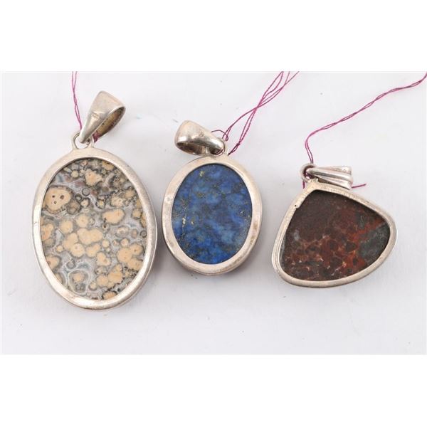(1) Large oval of ocean jasper set in sterling, measures 2") Fat oval lapis stone set in sterling, measuring 1 1/2". (1) Soft triangle of Jasper set in sterling silver, measures 1 1/2".