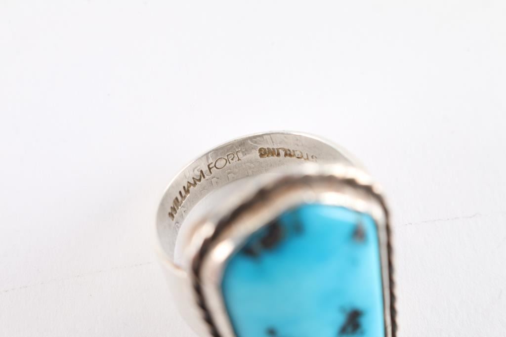 (1) Mans turquoise ring, maker marked William Ford. Large stone measures1 1/4" x 3/4" and is size 12.(1) 7 turquoise cabochons set in large sterling oval, ring is a size 10.