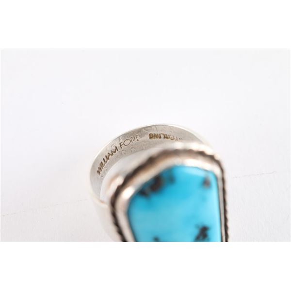 (1) Mans turquoise ring, maker marked William Ford. Large stone measures1 1/4" x 3/4" and is size 12.(1) 7 turquoise cabochons set in large sterling oval, ring is a size 10.