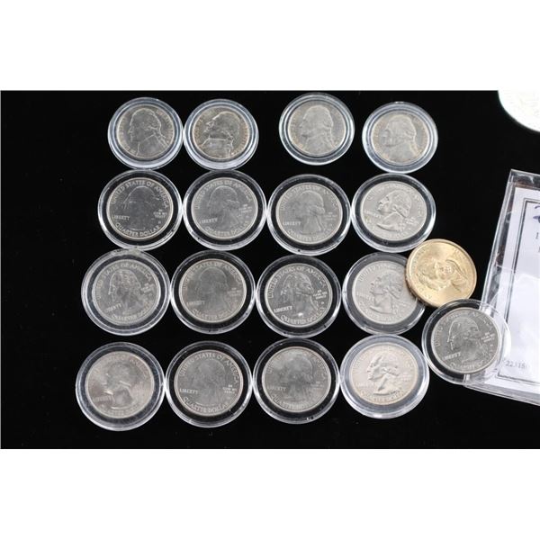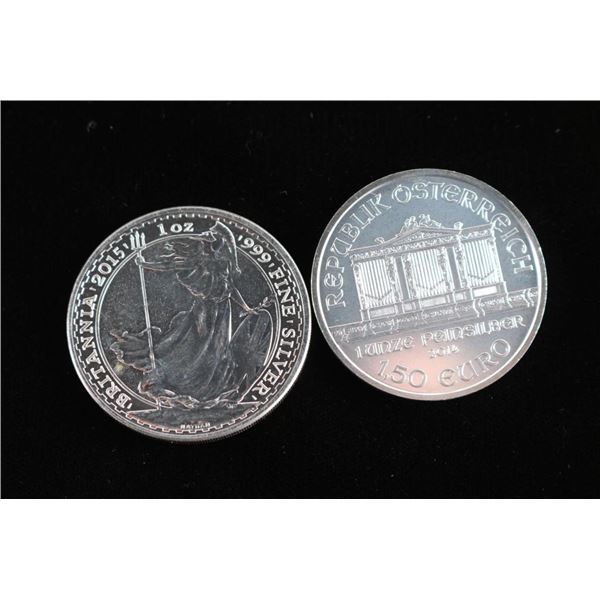 Includes:- (1) 1 Troy Ounce .999 Fine Silver 2014 Wiener Philharmoniker.- (1) 1 Troy Ounce .999 Fine Silver 2015 Elizabeth II 2 Pound (GBP) Coin.- (13) National Park and State Quarters, (4) Jefferson Nickels, (1) Andrew Jackson $1 coin.