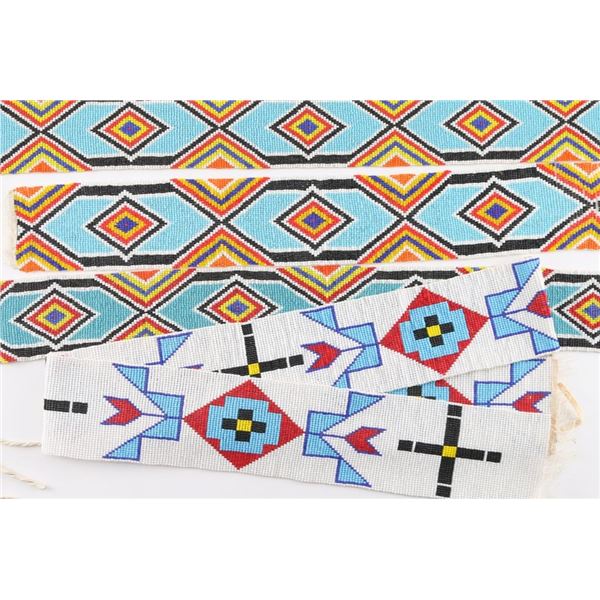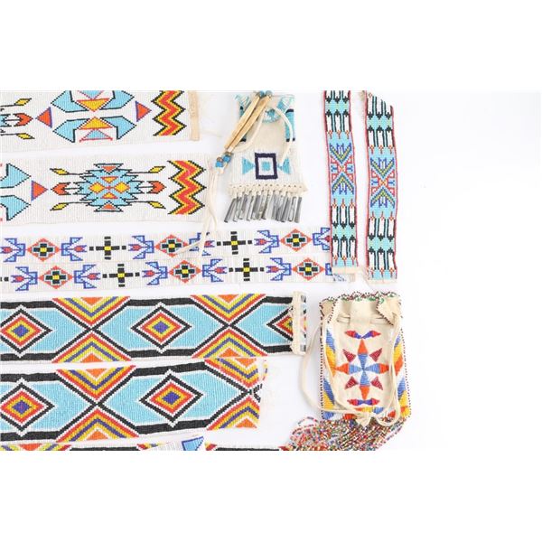 (2) Beaded leather pouches with beaded fringe, measuring 7" and 4 1/2" respectively. (1) beaded ceremonial item decorated with feathers, measures approximately 16" excluding leather fringe at bottom. (5) sets of beaded sashes, 4 of which are pairs and one of which has 3 matching strips of beadwork. Various designs and lengths.