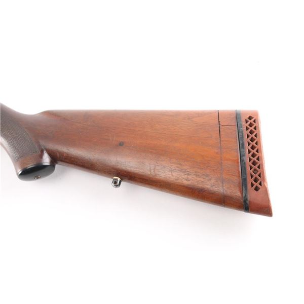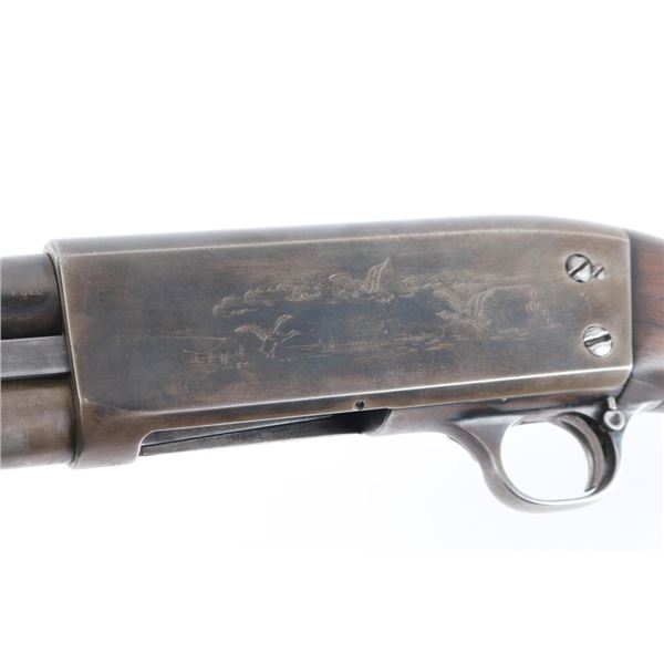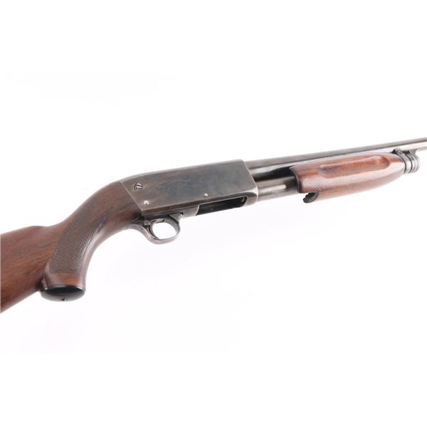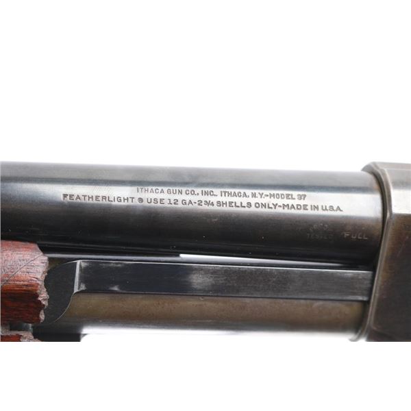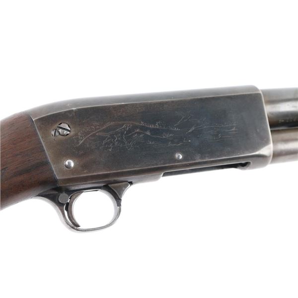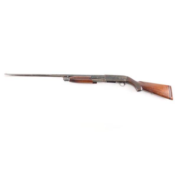 Featherweight Shotgun. Pump-action. 30" barrel, orange fiber-optic sighting blade. Fed from a 5-rd tube magazine. Action is crisp/tight. Thumb safety on rear triggerguard. Blued steel. Walnut stock, and forearm. Dog/waterfowl scenes etched on receiver. Bore appears excellent/bright. WFS vented recoil pad. Metal finish is about 50% with friction wear on the tube. handling wear, mostly on the receiver and lower barrel, buttstock is sound, black grip cap, sling stud, it has been extended with a 1" peice of wood for longer LOP. There is a 2" chunk broken off the left lower forearm. Bore measures Full. LOP is 14 1/4". Manufacture 1956. NRA Condition-Fair. C&R Firearm.