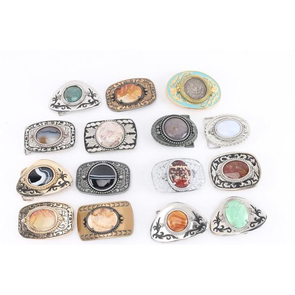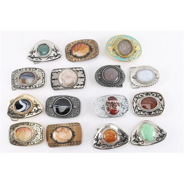 Miscellaneous belt buckles including one with a Morgan silver dollar at center.