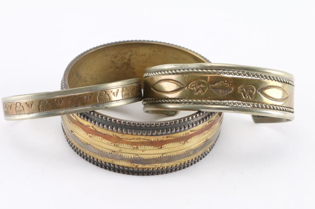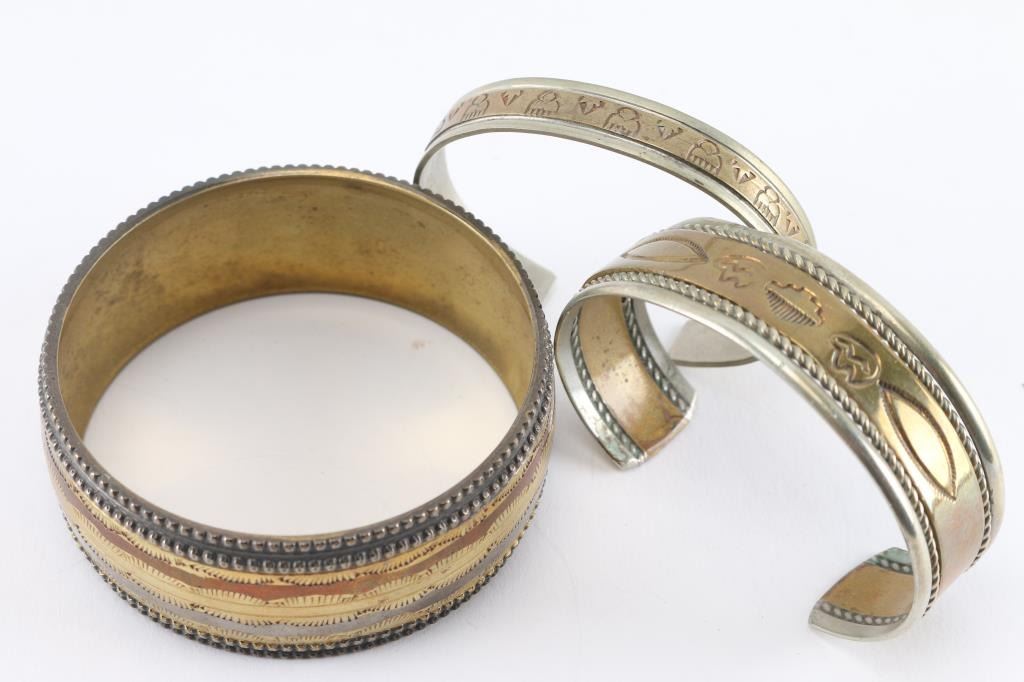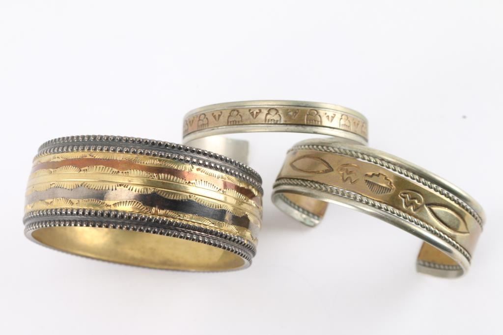 (1) Sterling silver and 12k gold filled cuff with native American designs. Measures 7 1/2" with gap and 3/4" wide. (1) Sterling silver cuff with gold accent and native American design. Measures 7" with gap. (1) Brass bangle with silver trim and gold etching around silver and copper. Meaures 9" around.