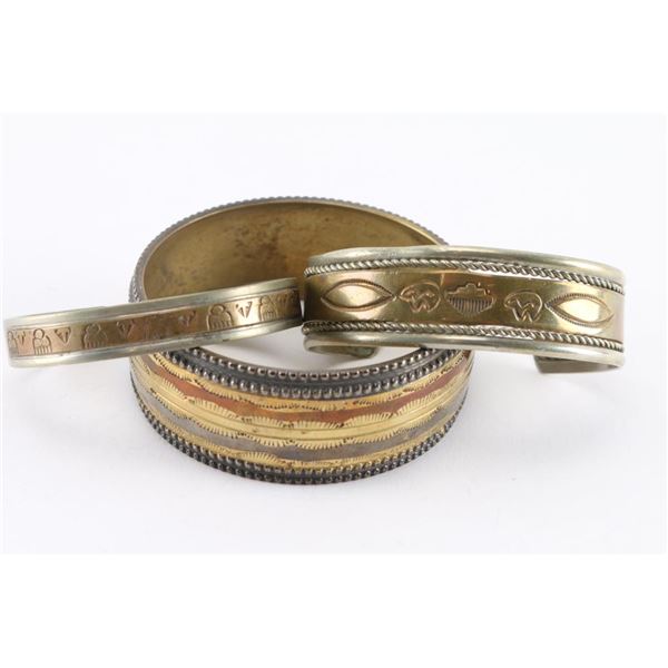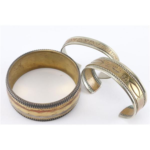 (1) Sterling silver and 12k gold filled cuff with native American designs. Measures 7 1/2" with gap and 3/4" wide. (1) Sterling silver cuff with gold accent and native American design. Measures 7" with gap. (1) Brass bangle with silver trim and gold etching around silver and copper. Meaures 9" around.