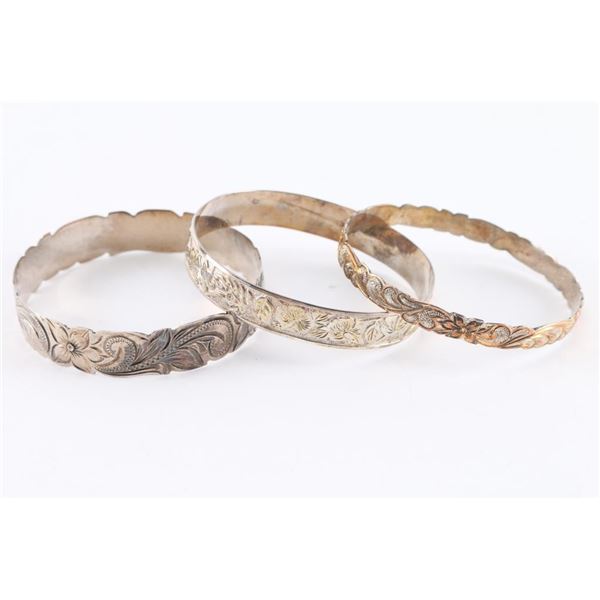 Known as Hawaiian bracelets, two are size 8 and one is size 81/2. They are sterling silver with varying widths and patterns, and one is accented with copper.