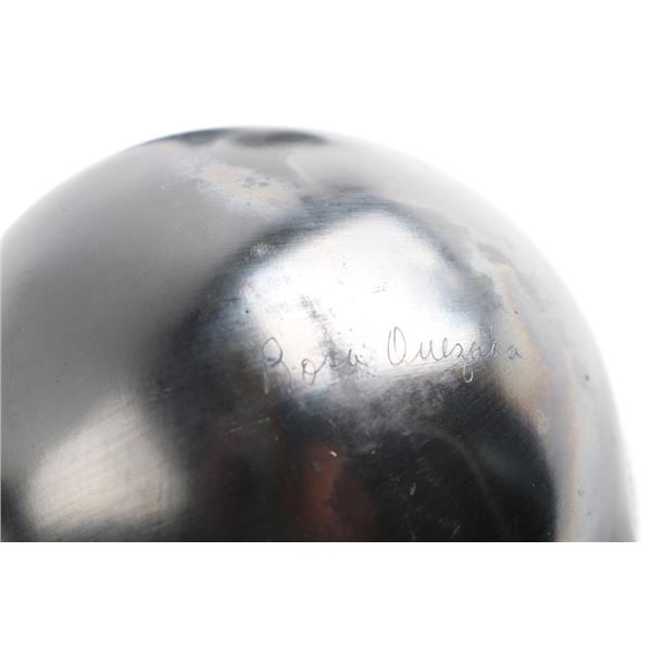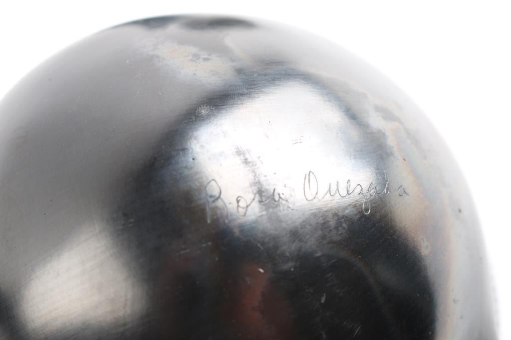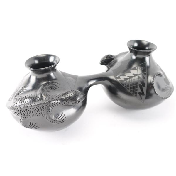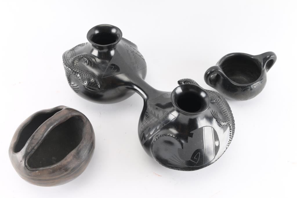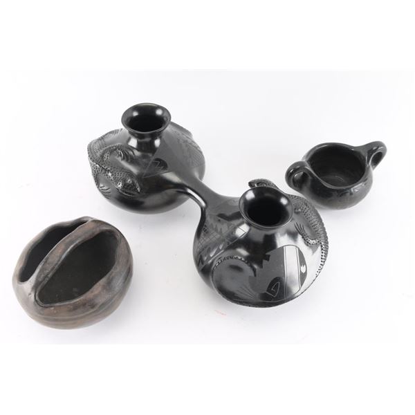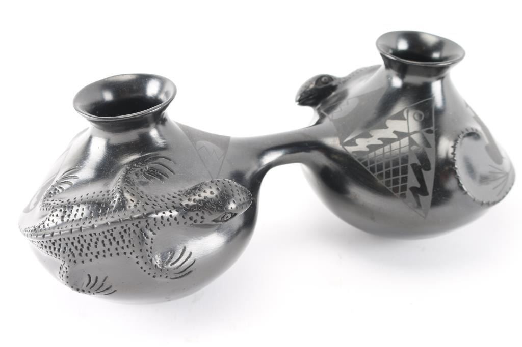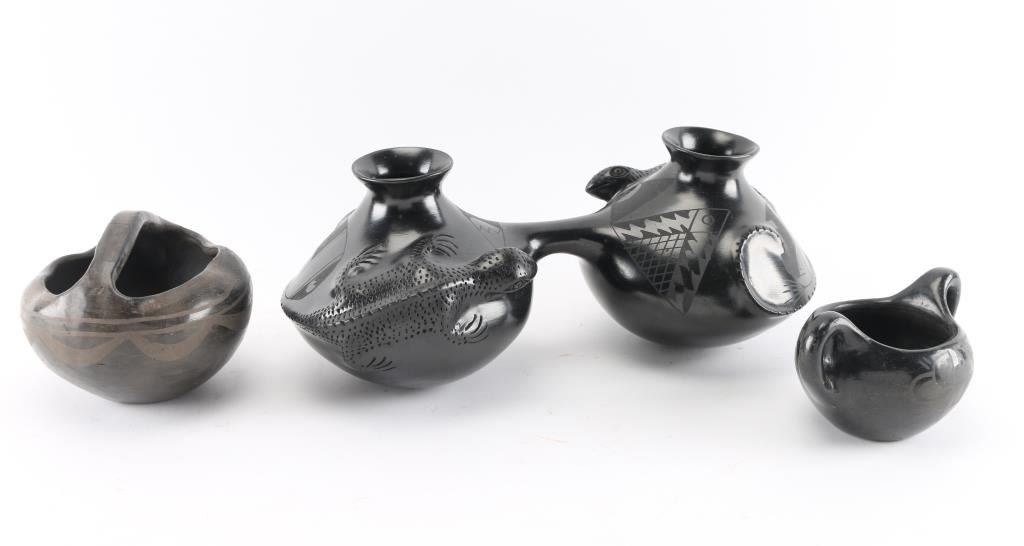 (1) Beautiful double connected pot by Rosa Quezada. Each pot features a large three dimensional lizzard. In excellent condition. Measures approximately 14" across by 7" deep and 5 1/2" tall.(1) Handled black on black basket pot, faded, meauring 5" tall by 6" around.(1) Smaller double handled pot, black on black, measuring 3" tall by 3" around. Slight wear.