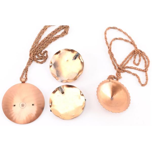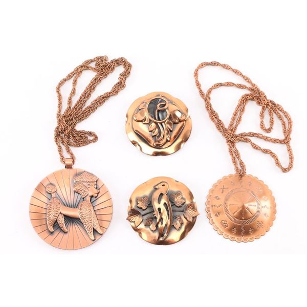 Copper poodle pendant measures 2 1/2" around on copper chain measuring 14 1/2" from drop. Copper native American designs on round disc measuring 2 1/4" around on copper chain measuring 14 1/2" from drop. Includes two copper pendants measuring 2 1/2" around, one with a bird motif and one a leaf motif.