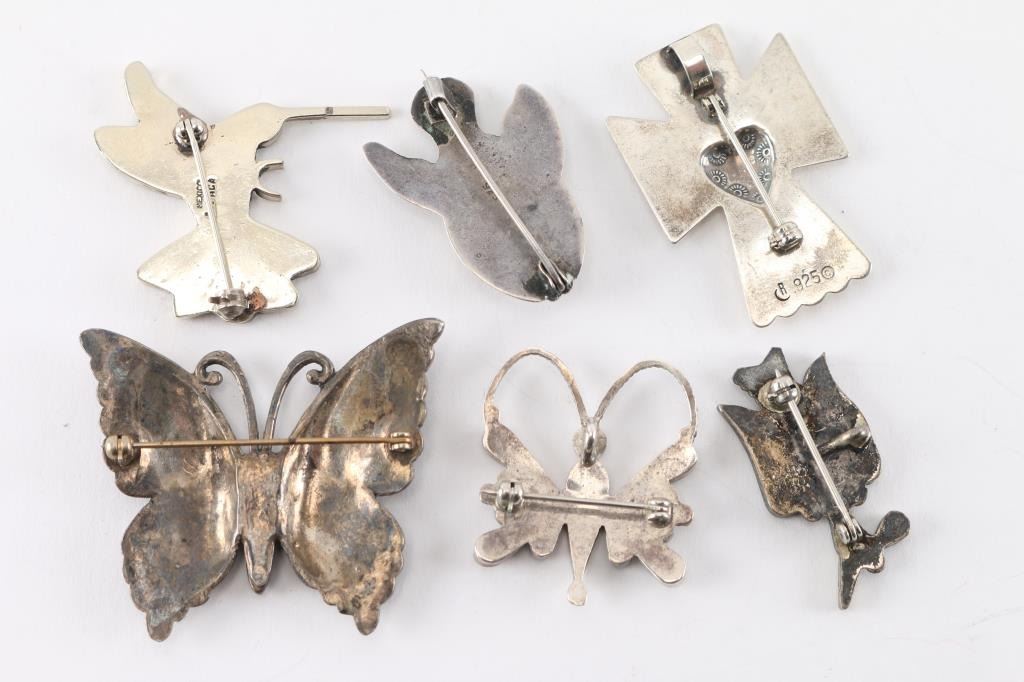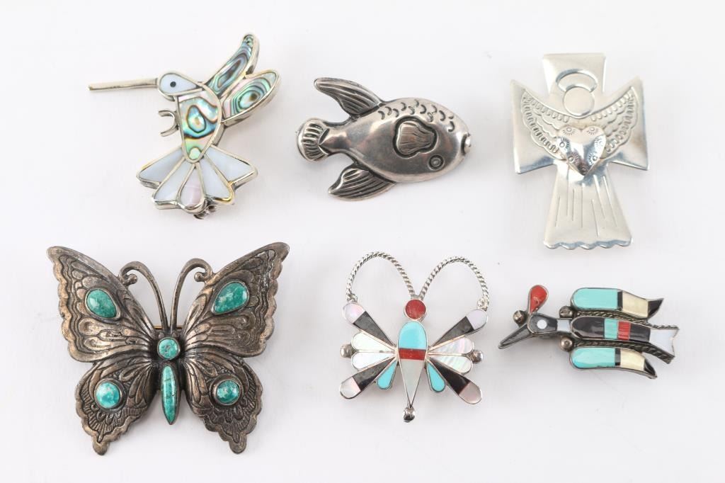 Sterling butterfly pin, Zuni inlaid butterfly pin,Hopi inlaid bird, sterling fish pin, angel cross pin, Mexican Inlaid hummingbird pin.