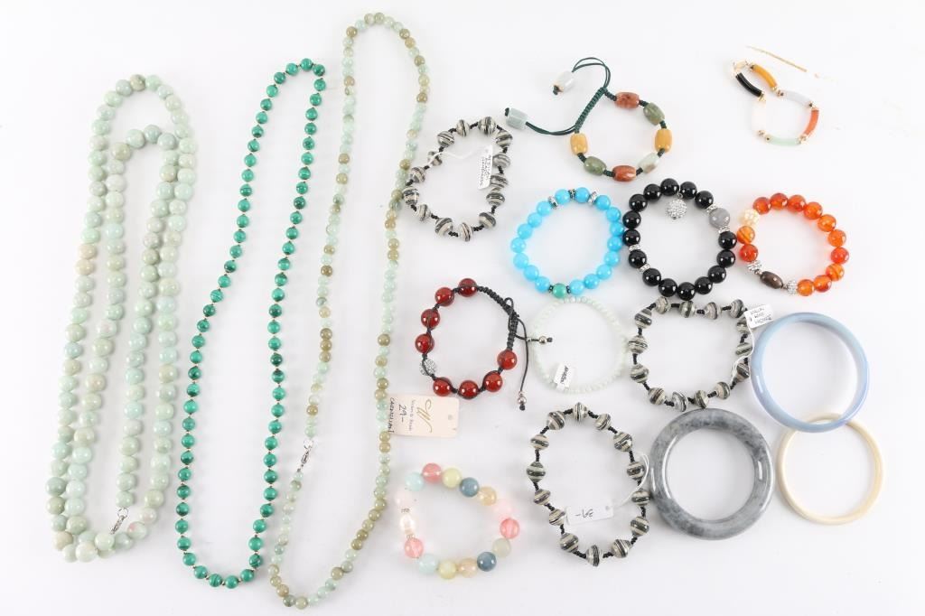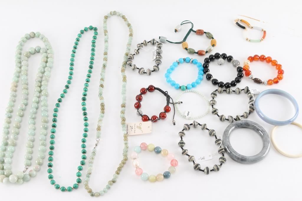 (3) Necklaces; (3) Small strands of hand-made African beads; (8) Bracelets; (3) Stone bangles.