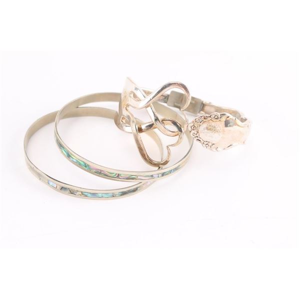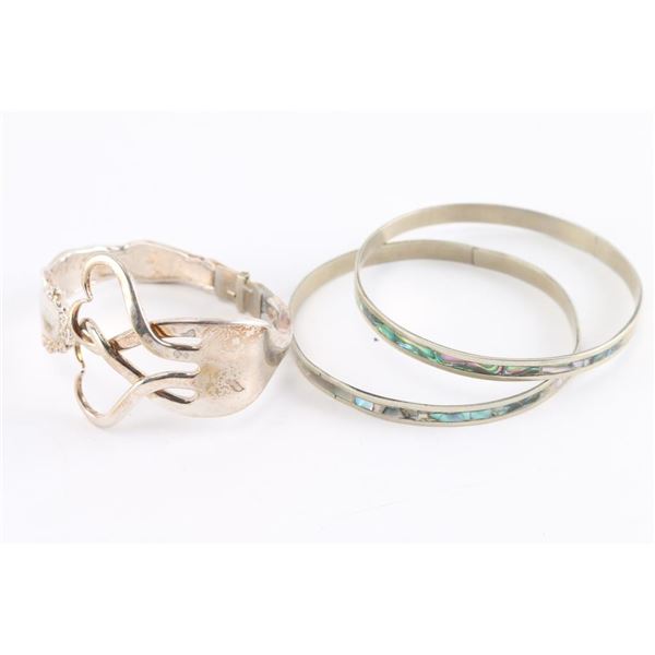 One is made from a fork into two intertwined hearts and has a hinge for easy on and off. The other two are shell inlaid bangles.