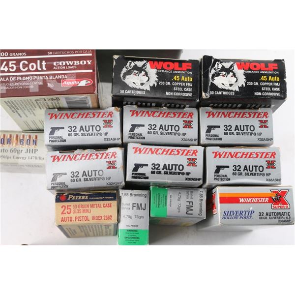 Includes: 480+rds of .32 ACP Winchester, Peters, Hornady, and Corbon ammunition; 50rds of .45 Colt Aguila ammunition; 100rds of .45 ACP Wolf ammunition; 100rds of 7.62 Browning Sellier & Bellot ammunition.***COUNTS ARE APPROXIMATE (+/-)***