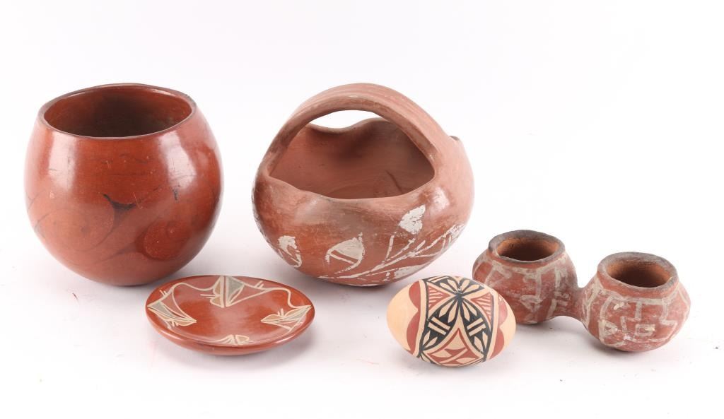 Maricopa pot with faded black painted design. Measures 4 3/4" by 4" around. Red handled pot with white paint. Measures 5" tall by 6" around. Small double connected pots measuring 5 1/2" across and 2" deep, 2 1/4" tall. A small redware plate from Mesa Verde in 1961, measuring 4 1/2" around. A painted egg shape measuring 3 1/3" long and about 2" wide.
