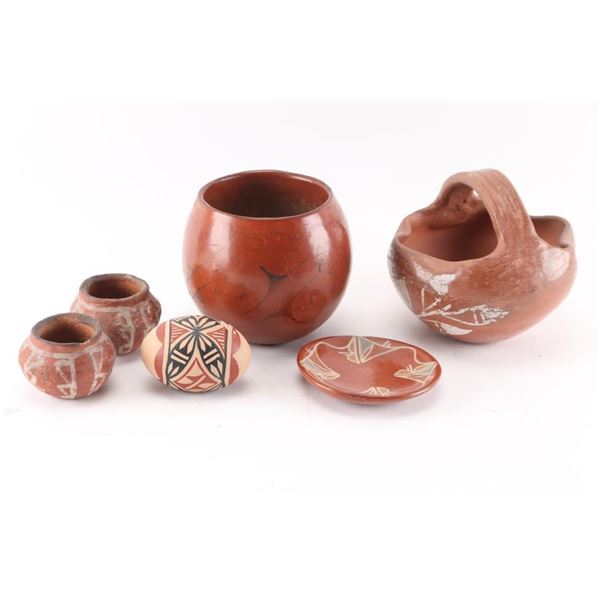 Maricopa pot with faded black painted design. Measures 4 3/4" by 4" around. Red handled pot with white paint. Measures 5" tall by 6" around. Small double connected pots measuring 5 1/2" across and 2" deep, 2 1/4" tall. A small redware plate from Mesa Verde in 1961, measuring 4 1/2" around. A painted egg shape measuring 3 1/3" long and about 2" wide.