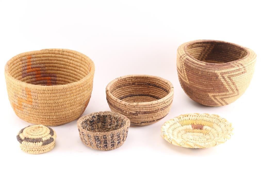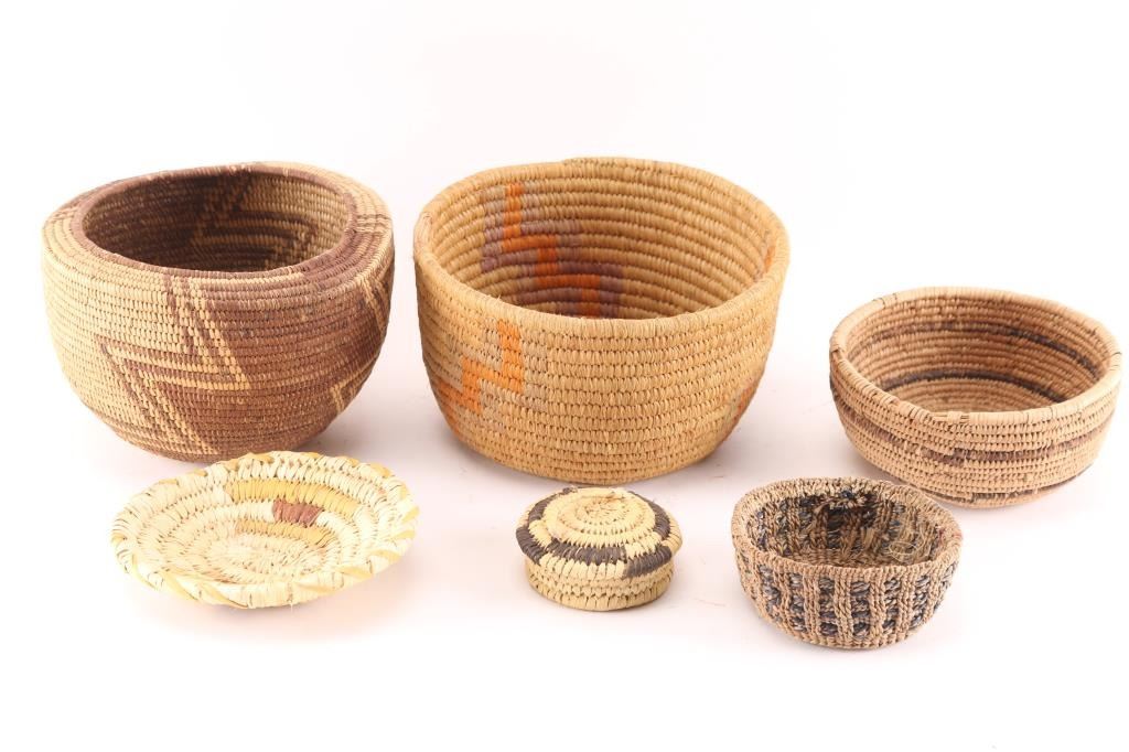 (2) Small Papago measuring 2" x 1 2/3" and 5" x 4 1/4". Both in good condition. (1) Small Piaute measuring 1 1/2" x 3 1/2". (3) Miscellaneous baskets measuring 4 3/4" x 2 1/4"; 6" x 4"; and 6 1/2" x 4".