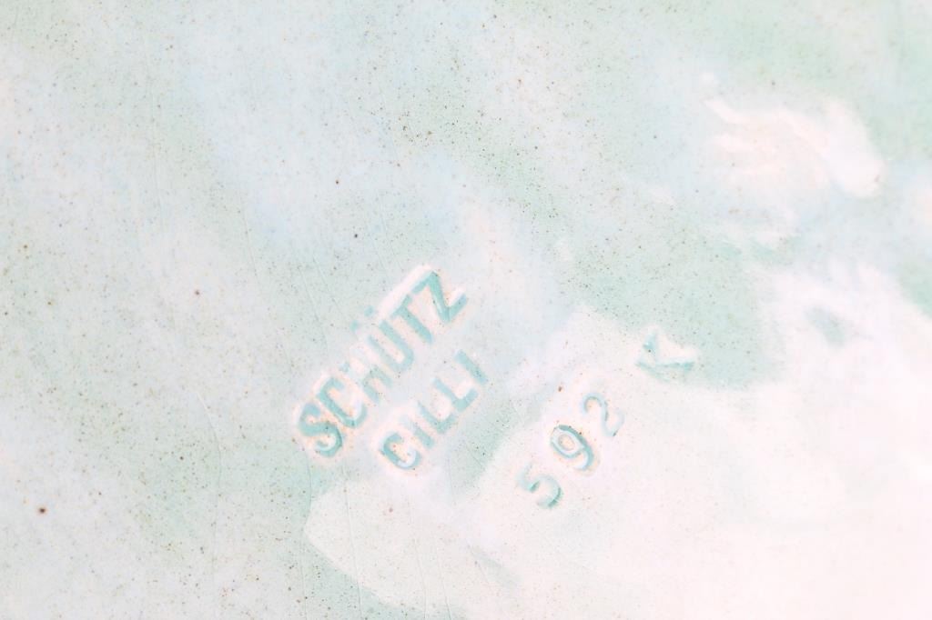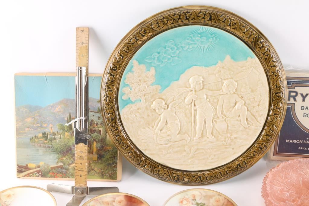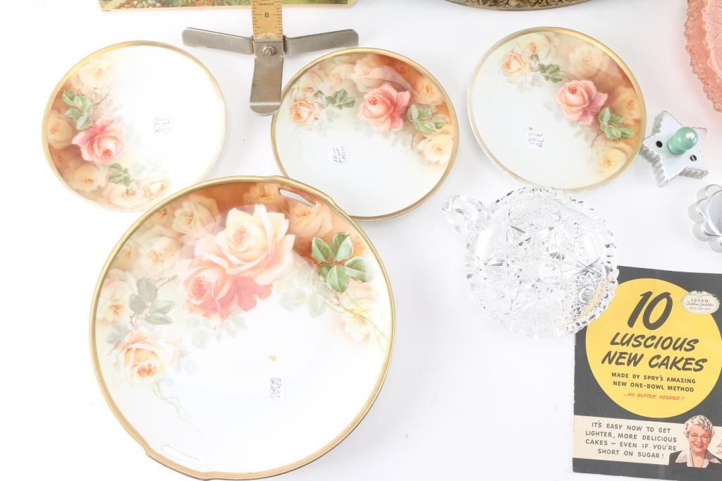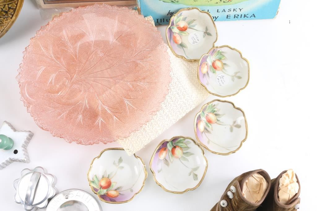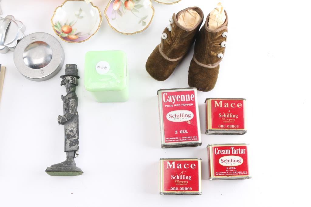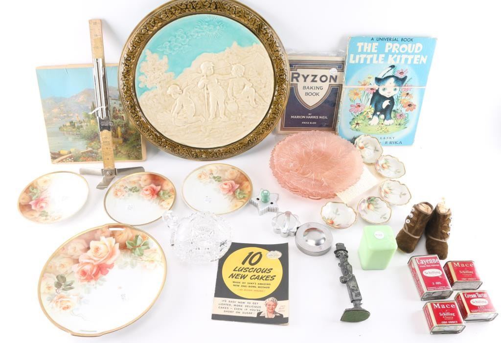 Includes: (1) Vintage "Old Snifter" corkscrew(1)Glazed ceramic majolica with embossed scene by Schutz Cilli. (4) Reinhold Schlegelmilch plates. (5) Nippon hand painted dishes. (1) Glass nappy dish bowl. Antique baby shoes. Cookbooks, cookie cutters, spixe cans and more.