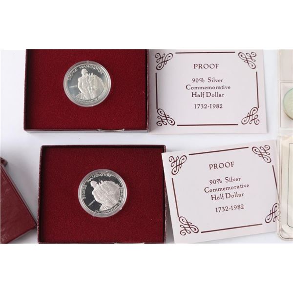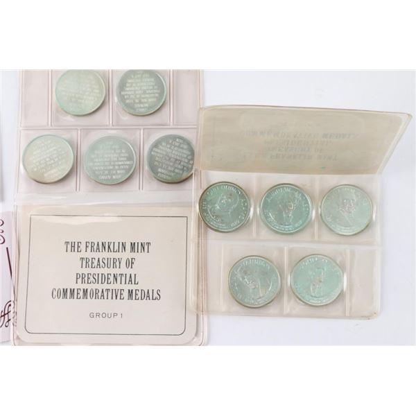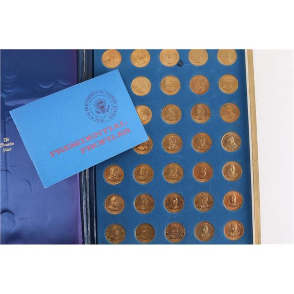 57 total coins. (35) Franklin Mint Treasury of Presidential Commemorative Medals Set, circa 1968. In original Case with a booklet giving details about each of the presidents, from George Washington to Lyndon B. Johnson. Case cover has been taped on due to damage. (15) Presidential medals in plastic sleeves. (2) George Washington silver half dollars w/COA.