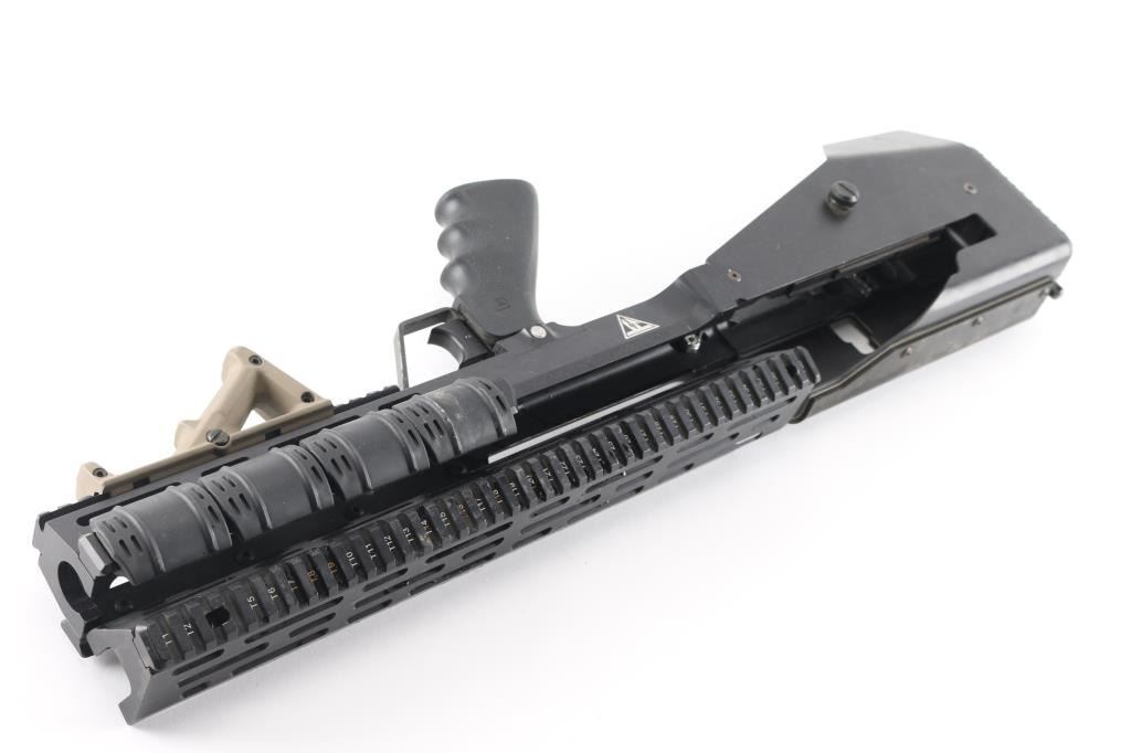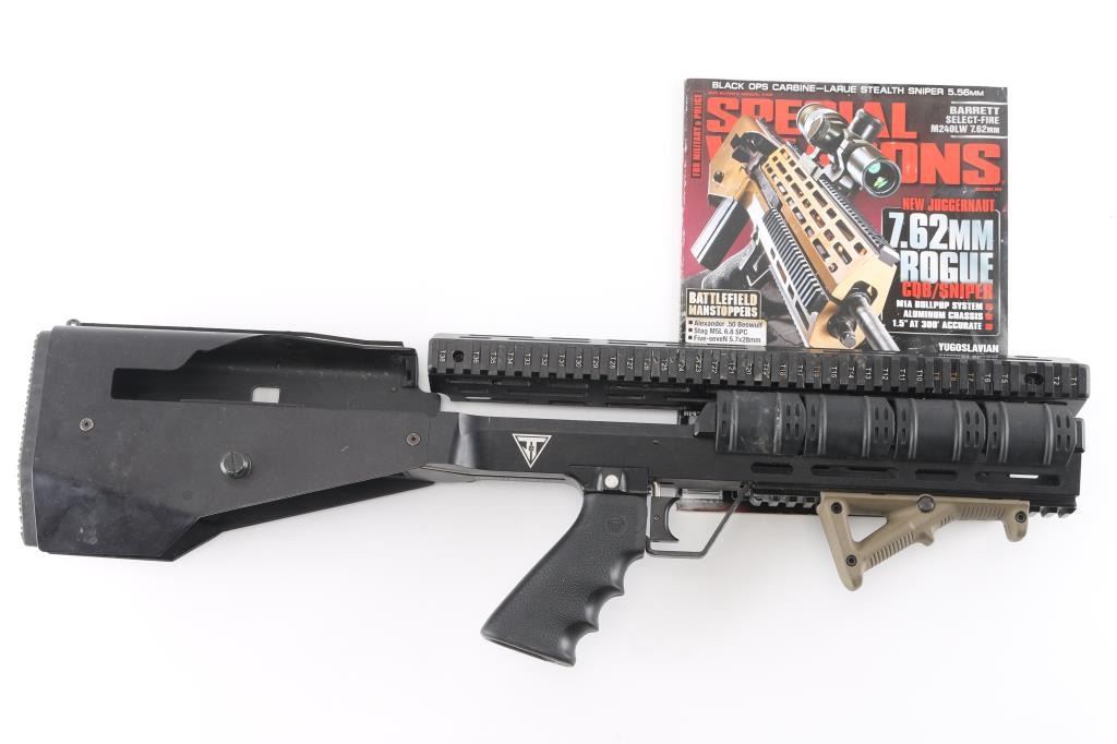 Rouge" drop-in conversion kit for M1AM14 rifles to Bullpup configuration. Includes the top rail. The main chassis separates with that big screw in the rear so you can drop in the frame of the gun, the side clamp, the front clamp, and the side charging handle that mounts on the op rod. 1913 Picatinny located on the top, bottom, left, and right. Hand stop installed on the bottom, and 2" Picatinny Rail Covers installed on the right and left rails. Titanium Grey finish. Juggernaut Tactical does not make these anymore. Included is the December 2011 issue of Special Weapons magazine featuring this kit on the cover with article on them. Very good condition.