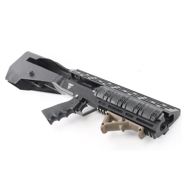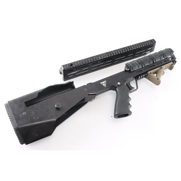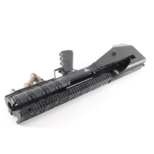 Rouge" drop-in conversion kit for M1AM14 rifles to Bullpup configuration. Includes the top rail. The main chassis separates with that big screw in the rear so you can drop in the frame of the gun, the side clamp, the front clamp, and the side charging handle that mounts on the op rod. 1913 Picatinny located on the top, bottom, left, and right. Hand stop installed on the bottom, and 2" Picatinny Rail Covers installed on the right and left rails. Titanium Grey finish. Juggernaut Tactical does not make these anymore. Included is the December 2011 issue of Special Weapons magazine featuring this kit on the cover with article on them. Very good condition.