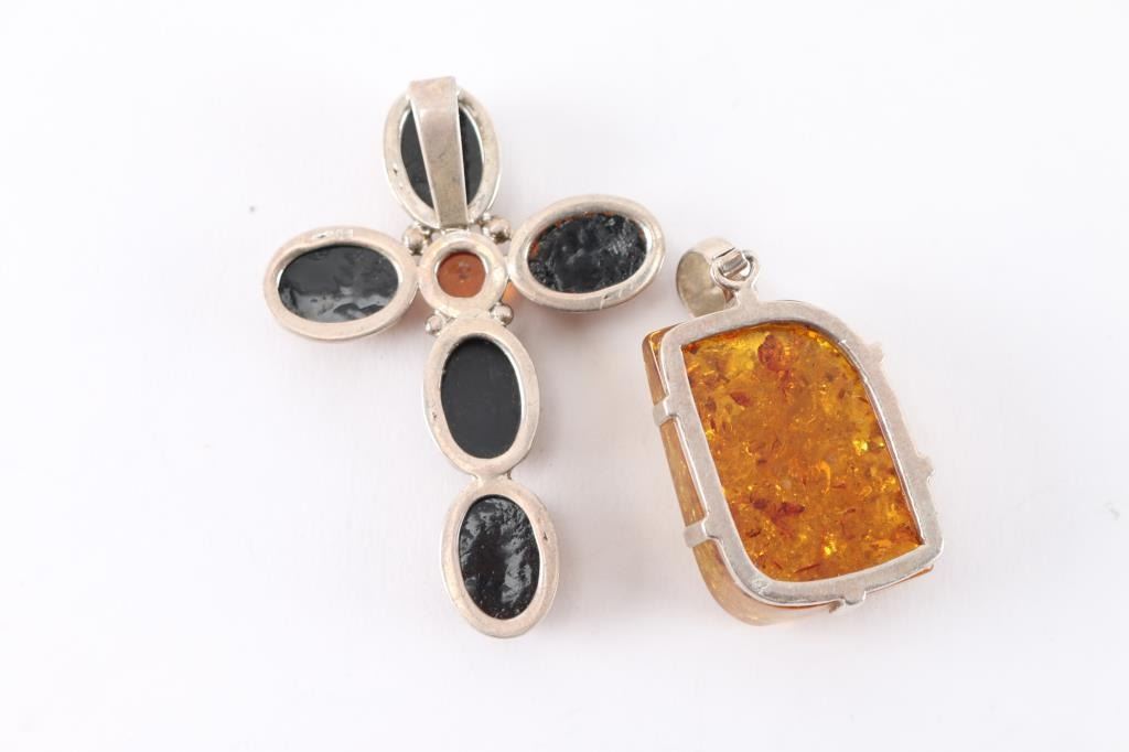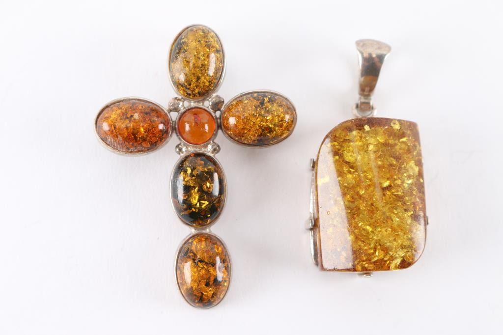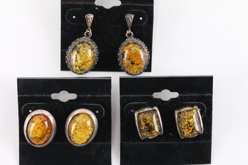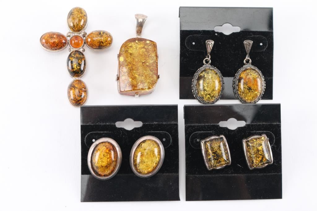 (2) Pendants of amber set in sterling silver.(3) Pair of amber and sterling silver pierced earrings, including Baltic amber and green amber.
